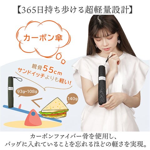 | 商品説明 | 【手軽に持ち歩けて使い勝手も抜群】天気の変化から守る!「pokectプラス 超軽量カーボン雨傘」親骨55cmサイズ。【365日持ち歩ける超軽量設計】カーボンファイバー骨を使用し、バッグに入れていることを忘れるほどの軽さを実現。【風にも負けないフレーム構造】軽いだけでなく、風速15m/sまで耐えられる!強度や耐久性にも優れたつくり。【雨粒をサッと弾く超撥水加工】細い糸で打ち込まれ、目の詰まった15デニール生地。軽く振るだけで、水切れもばっちり。【いつでもどこでもイージーオープン】傘骨をポキポキ折る手間なくスムーズに開閉できる手開き仕様。一般的な大きさの親骨55cm。【安心・安全のセーフガード付き】爪や指を挟むのを防止するカバーを装備。開閉時のケガを防ぎ、ネイルを施した爪も保護。【サッとまとまる面ファスナーバンド】傘生地をまとめるバンドは、面ファスナー式。たたむ時も手間取らず、すっきりひとまとめ。【持ち歩きに便利な収納袋が付属】傘生地と同じカラーの収納袋。バッグに忍ばせて、スマートに持ち運び。【シーンを選ばないベーシックカラー】オン・オフ問わず持ちやすいカラー&シンプルデザイン。1本持っていれば安心。 |