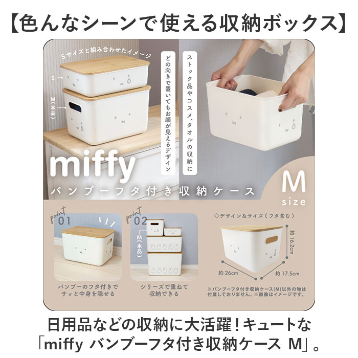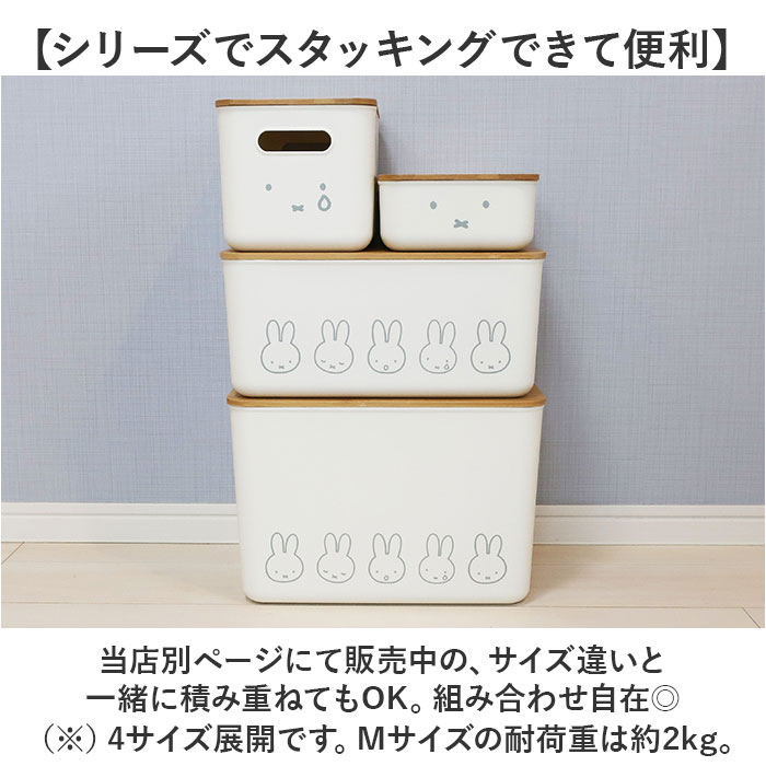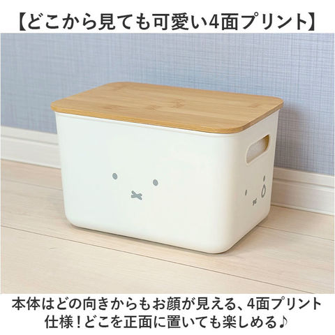 商品説明【色んなシーンで使える収納ボックス】日用品などの収納に大活躍!キュートな「miffy バンブーフタ付き収納ケース M」。【どこから見ても可愛い4面プリント】本体はどの向きからもお顔が見える、4面プリント仕様!どこを正面に置いても楽しめる♪【シリーズでスタッキングできて便利】当店別ページにて販売中の、サイズ違いと一緒に積み重ねてもOK。組み合わせ自在◎(※)4サイズ展開です。Mサイズの耐荷重は約2kg。【中身を隠せるバンブーフタ付き】見られたくない物も、サッと被せるだけ。ナチュラルな風合いのバンブー素材がおしゃれ♪【程よい大きさで使いやすいMサイズ】ストック品やコスメ、タオルなどの収納にぴったりな容量約5L。【移動もラクラク、持ち手付き】本体の両サイドに持ち手付き。指を入れて、サッと持ち上げて移動できる!【色んなインテリアに素敵にマッチ】キャラクターを主張しすぎないデザインが魅力。空間のほっこり可愛いアクセントに♪