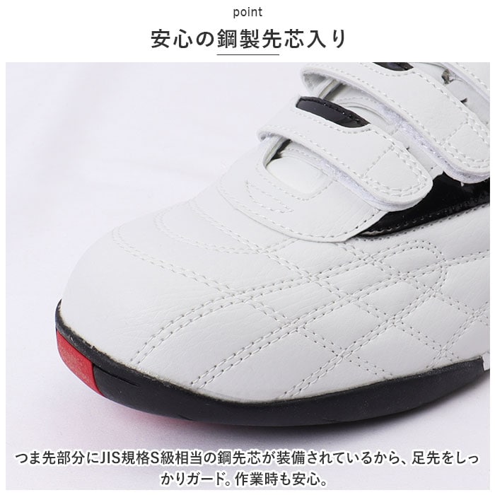 | 商品説明 | 作業時も安心・安全◎スニーカーのような見た目で手軽に使える「安全靴」」が登場。【軽量&ワイド設計】重いイメージのある安全靴とは異なり、履きやすい軽さに設計。足幅の広い方に対応した4E幅広構造。【ストレスなく履けるローカットデザイン】足首が固定されず、自由に身動きしやすい!脱ぎ履きもスムーズなローカットデザイン◎【安心の鋼製先芯入り】つま先部分にJIS規格S級相当の鋼先芯が装備されているから、足先をしっかりガード。作業時も安心。【着脱しやすくしっかりホールド】・3本の面ファスナーを留めるだけ!ホールド力もアップし、自分サイズに合った快適な履き心地。【足首が痛くなりにくい!】足首まわりに当たる部分にクッション性をプラス。心地よくフィットして、長時間履いていても痛みや疲れを感じにくい仕上がり。【取り外せるインソール】インソールは取り外し可能。お手入れしやすくいつも清潔◎【安定感のあるソール】底面に凹凸を施した、グリップ力のあるソール。濡れた路面でも滑りにくい仕様。【暗い場所で反射】暗い場所でも認識する反射材をかかとにプラス。【選べるカラー】年代問わず履きやすいカラーをラインナップ。工事現場や作業場などで大活躍。 |