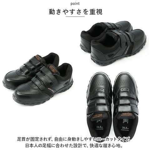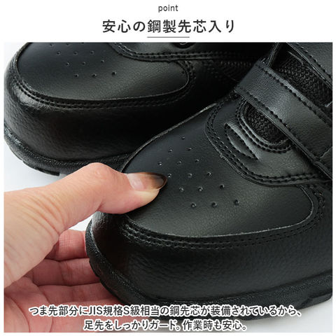| 商品説明 | 作業時も安心・安全◎スニーカーのような見た目で手軽に使える「安全靴」が登場。【動きやすさを重視】足首が固定されず、自由に身動きしやすいローカットタイプ。日本人の足幅に合わせた設計で、快適な履き心地。【安心の鋼製先芯入り】つま先部分にJIS規格S級相当の鋼先芯が装備されているから、足先をしっかりガード。作業時も安心。【着脱しやすくしっかりホールド】・3本の面ファスナーを留めるだけ!ホールド力もアップし、自分サイズにフィット。【ソフトなインソール】シューズとのフィット感をアップさせるインソール。取り外してお手入れできるから衛生的。【歩きやすさが向上】屈曲性があり、つま先が上を向いた形状。つまづきにくく、蹴り上げやすい!【安定感のあるソール】底面に凹凸を施した、グリップ力のあるソール。濡れた路面でも滑りにくい仕様。【選べるカラー】年代問わず履きやすいカラーをラインナップ。工事現場や作業場などで大活躍。 |