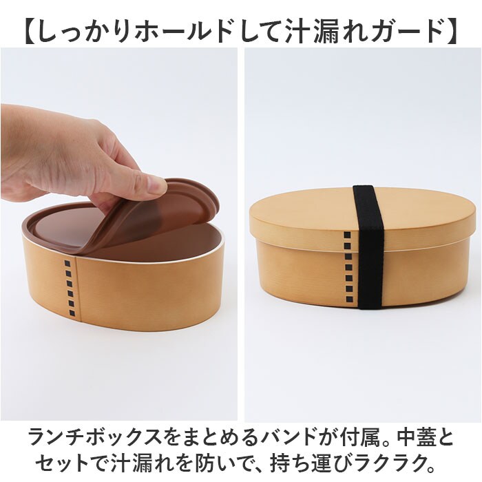 | 商品説明 | 【毎日のランチタイムをもっと豊かに】使い勝手が良く、デイリーに活躍。仕切付の「わっぱ小判一段ランチBOX」が新登場。【和の風合いを感じるデザイン】木目調のベーシックな仕上がり。温かみのあるカラーで、おかずが美味しく映える☆【OLさんや学生さんのランチに最適】片手で持ちやすく、屋外での食事にも便利な1段式の小判型。女性が使いやすい容量550ml。【仕切りで盛り付けをキープ】おかずが片寄りにくい仕切り付き。ごはんにおかずの色や味が移るのを防止。【レンジ対応!熱々ごはんが復活】中蓋を外して、電子レンジでの温めが可能。オフィスでも温かいランチを楽しめる!【食洗機が使えてお手入れラクラク】中蓋を除いて、食洗機の使用OK。お手入れしやすく、忙しい毎日の味方◎【しっかりホールドして汁漏れガード】ランチボックスをまとめるバンドが付属。中蓋とセットで汁漏れを防いで、持ち運びラクラク。【飽きが来ず長く愛用できるアイテム】年代問わず使いやすい、ナチュラルでおしゃれなお弁当箱。安心の日本製。 |