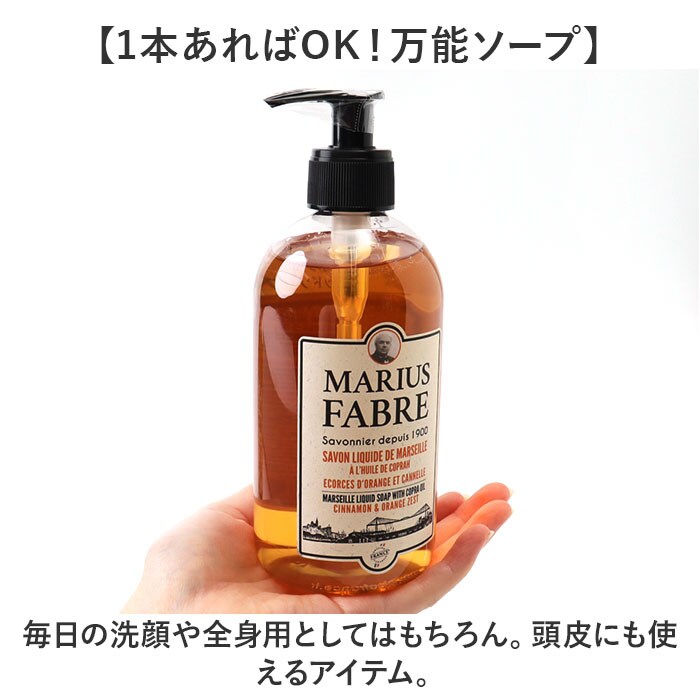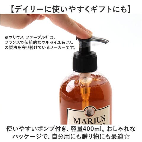 | 商品説明 | 【長く愛され続ける伝統のソープ】ナチュラルでマイルドな使用感♪「サボンドマルセイユ1900 リキッドソープ」。【お肌に優しい植物性オイルベース】着色料・防腐剤・人工香料不使用!天然植物油がベースの、フランス製自然派石けん。【泡切れが良く、つっぱり知らず】泡立ち・泡切れ抜群。素肌の潤いを守りつつ洗いがりはスッキリ、敏感肌の方も安心◎【汚れを取り除いて顔も身体も綺麗に】きめ細かい泡で、全身を洗い上げるリキッドソープ。汚れを優しく洗浄し、清潔なお肌をキープ。【1本あればOK!万能ソープ】毎日の洗顔や全身用としてはもちろん。頭皮にも使えるアイテム。【心地よく香るフレグランスタイプ】天然香料をプラスし、香りも楽しめるのが特徴。豊かな香りで、心もリラックス♪【デイリーに使いやすくギフトにも】使いやすいポンプ付き、容量400ml。おしゃれなパッケージで、自分用にも贈り物にも最適☆(※)マリウス ファーブル社は、フランスで伝統的なマルセイユ石けんの製法を守り続けているメーカーです。 |