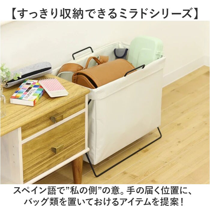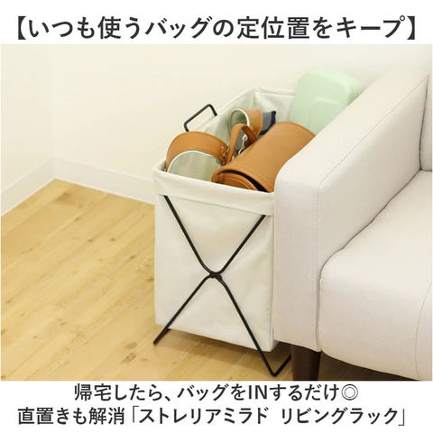 | 商品説明 | 【いつも使うバッグの定位置をキープ】帰宅したら、バッグをINするだけ◎直置きも解消「ストレリアミラド リビングラック」。【すっきり収納できるミラドシリーズ】スペイン語で”私の側”の意。手の届く位置に、バッグ類を置いておけるアイテムを提案!【大きなバッグもすっぽりサイズ】マチもしっかりあり、リュックやビジネスバッグ、ランドセル、スクールバッグも収納可能。【安定感があり丈夫なつくり】取り外し自在な底板付きで型崩れしにくい!本体はスチール素材等を使い、耐荷重は約10kg。【出し入れがスムーズでノンストレス】パッと取り出せて、サッと戻せる!デスクまわりはソファの横に置いておけて便利。【ファッション小物や新聞も一緒に】出かける際に身につけるストールやマフラー。新聞なども入れておける内ポケット付き。【掃除もラクチンな脚付きフレーム】底面が床につかず、ホコリが溜まりにくい◎お掃除の手間を軽減できるのも嬉しいポイント。【移動しやすく収納も省スペース】持ち上げやすい取っ手付き。使わない時は折りたたんで、場所を足らずに隙間収納。【空間に馴染むデザイン&カラー】装飾のないシンプル設計。温かみのあるナチュラルカラーで、家具などとも相性抜群。 |