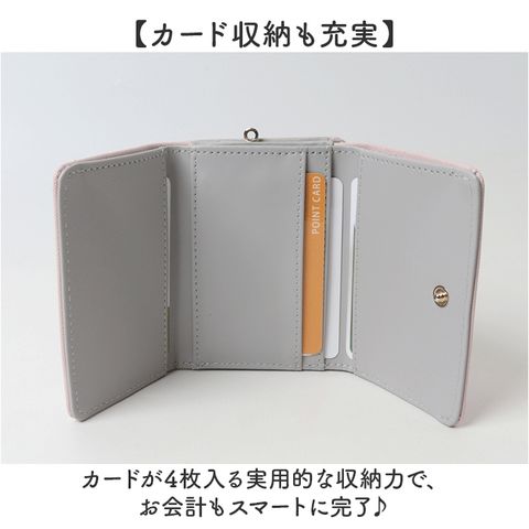 | 商品説明 | 【可愛さ満点の財布】毎日持ち歩きたくなる、キュートながま口財布♪【ガバッと開く小銭入れ】独立型の小銭入れは大きく開いて中身が見やすく、出し入れもスムーズ◎【カード収納も充実】カードが4枚入る実用的な収納力で、お会計もスマートに完了♪【手のひらサイズ】コンパクト設計で、小さなバッグにもすっぽり収まる便利さ。【多彩な柄から選べる】持つたび気分が上がる!かわいいデザインのラインナップ。 |