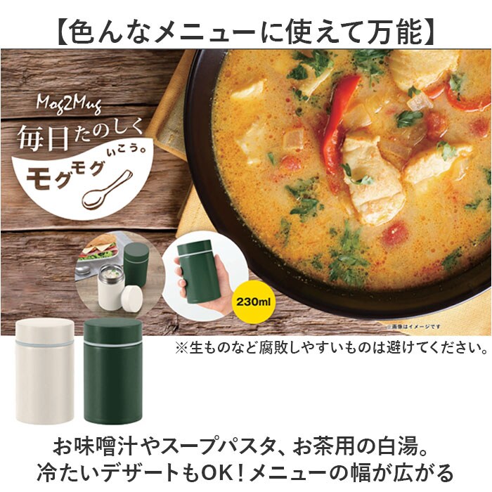 | 商品説明 | 【ランチの時間がもっと楽しく豊かに】毎日楽しくモグモグいこう!温冷対応で大活躍の「モグモグ スープマグ 230ml」。【いつものランチにプラスワン♪】シンプルで使い勝手抜群!1人分に最適な容量230ml。ランチで手軽にスープを楽しめる♪【持ち運びに嬉しいコンパクトサイズ】手のひらサイズでかさばらず、ランチバッグにすっぽり。持ち運びがラクラク。【保温保冷両用でオールシーズン活躍】本体内側と外側が真空断熱された、ステンレス2重構造タイプ。温冷共に美味しさをキープ!【注ぎやすく食べやすい広口設計】大きめの具材も入れやすく、食べる時もスプーンですくいやすい◎底までしっかり洗えて衛生的。【お手入れしやすくデイリーに活躍】少ないパーツで、パッキンは取り外し可能。お手入れが簡単なのも嬉しいポイント。【色んなメニューに使えて万能】お味噌汁やスープパスタ、お茶用の白湯。冷たいデザートもOK!メニューの幅が広がる☆(※)生ものなど腐敗しやすいものは避けてください。【使う人を選ばないデザイン&カラー】どなたでも使いやすいユニセックス仕様。家族色違いで揃えたり、シェアもおすすめ! |