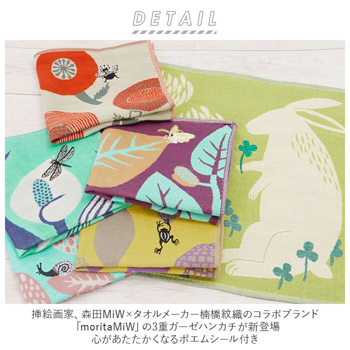 | 商品説明 | 挿絵画家、森田MiW×タオルメーカー楠橋紋織のコラボブランド「moritaMiW」の3重ガーゼハンカチが新登場。ふと気がつくと、ゆっくりとした世界が広がる♪MiWさんのあったかな絵の世界を映し出したデザイン。抱きしめたくなるくらい愛おしい、不思議な植物や日常の生き物たちのワンポイント刺繍がポイント。ふんわり軽く、優しい肌触りの3重ガーゼ素材を使用。心があたたかくなるポエムシール付き。毎日がもっとオシャレにハッピーに。しあわせの時間が流れるアイテム。 |