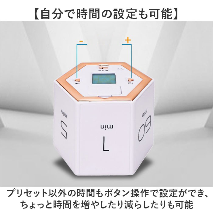 | 商品説明 | 【ユニークな形と機能性】ユニークな形と機能性が特徴的♪六角形型のタイマーが新発売。【最大60分まで設定可能】・1分から60分までの時間設定が可能!学習から料理、タスク管理など様々なシーンで活躍☆【簡単に時間設定が可能】上に数字を向けて置くだけで時間の設定が可能♪お子さまでも使いやすい◎【自分で時間の設定も可能】プリセット以外の時間もボタン操作で設定ができ、ちょっと時間を増やしたり減らしたりも可能【アラーム音でしっかりお知らせ】カウントダウン終了後、しっかりアラーム音がなり周囲へお知らせ。【シーン問わず使える消音機能】ライト点灯で終了をお知らせする消音機能。図書館などパブリックスペースでも使用可能。【中断する時はカウントストップ】離席する時やちょっと休憩したい時にカウントを止める一時停止機能付き。【壁や冷蔵庫に貼り付け可能】マグネット内蔵の壁や冷蔵庫に貼り付けができ置き場所に困らない。【やりすぎ対策にもオススメ】勉強のゲームや動画などのやりすぎ防止にも役立つ☆ |