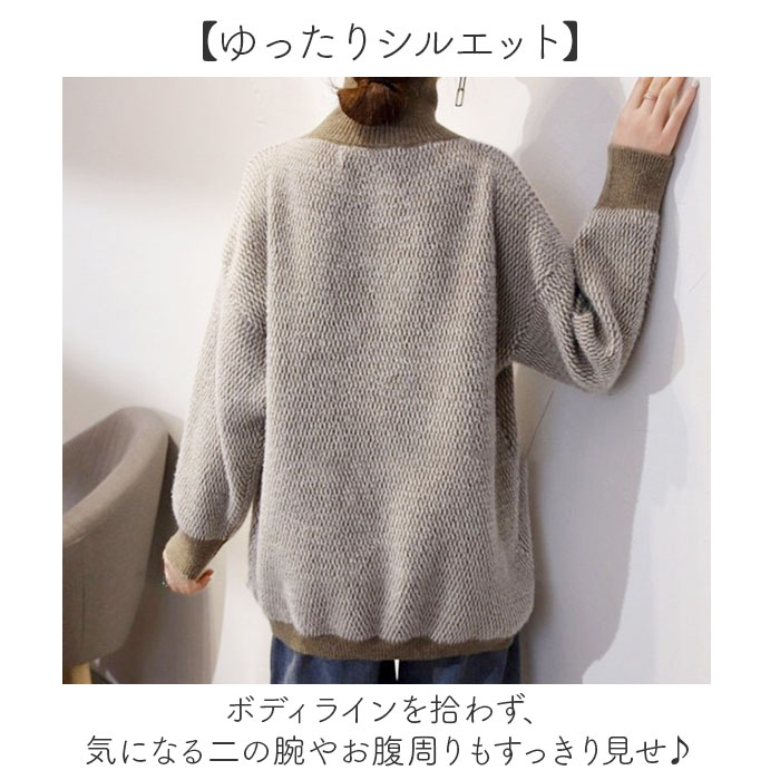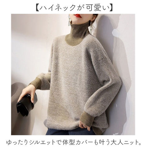 | 商品説明 | 【ハイネックが可愛い】ゆったりシルエットで体型カバーも叶う大人ニット。【ゆったりシルエット】ボディラインを拾わず、気になる二の腕やお腹周りもすっきり見せ♪【首元まで暖かハイネック】首元をしっかり包み込むハイネックデザインで、寒い季節も快適な着心地◎【こなれ感あるデザイン】袖口と首元、ボディ部分で異なるデザインが大人の遊び心を演出。【秋冬の定番カジュアル】デニムにもスカートにも合わせやすく、デイリーコーデに大活躍〇 |