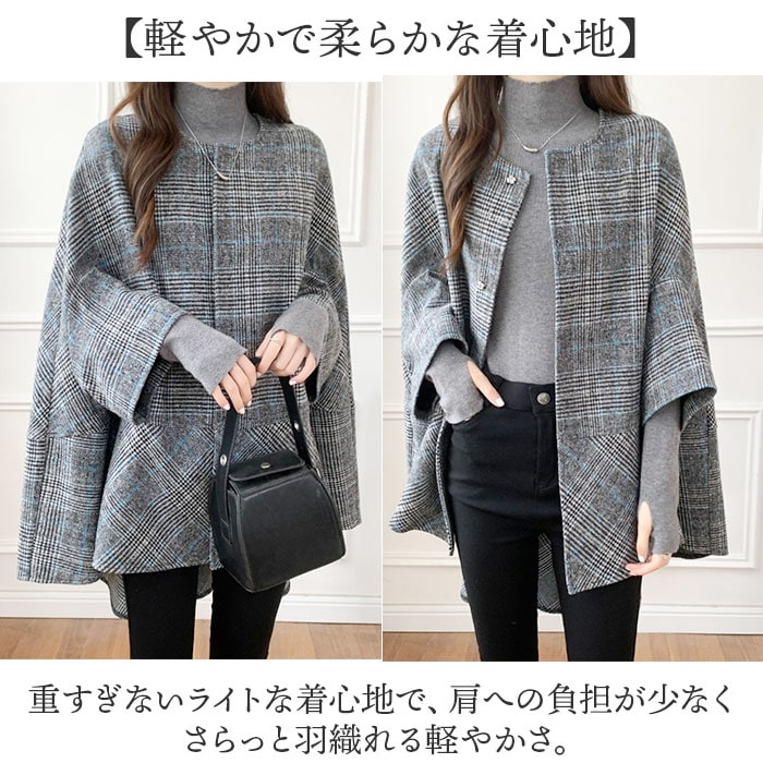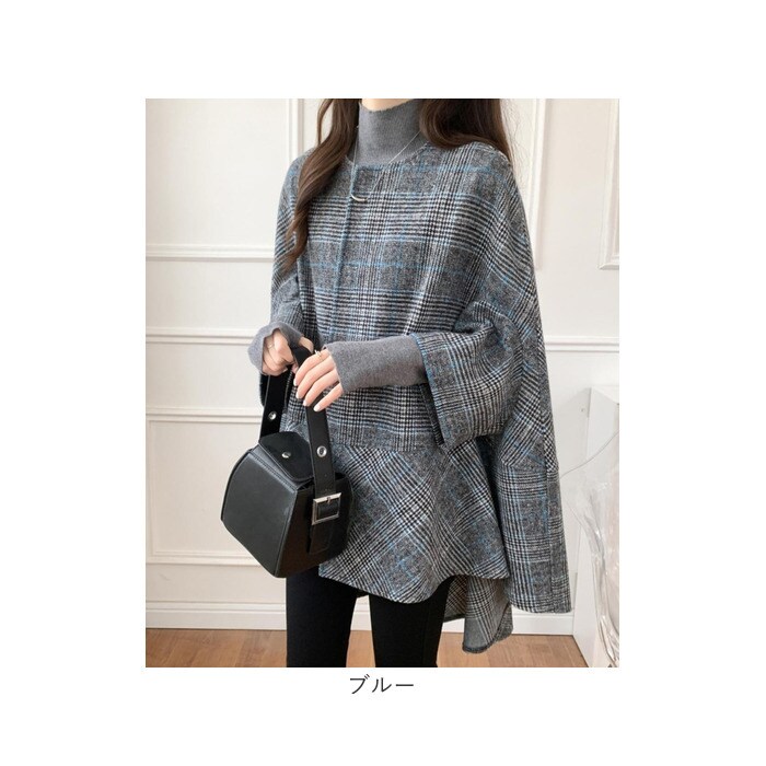 ポンチョ風ジャケット アウター チェック柄【ブルー】