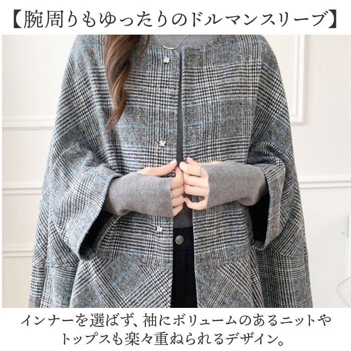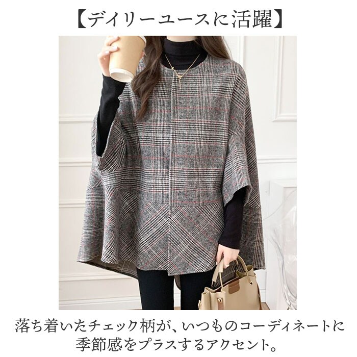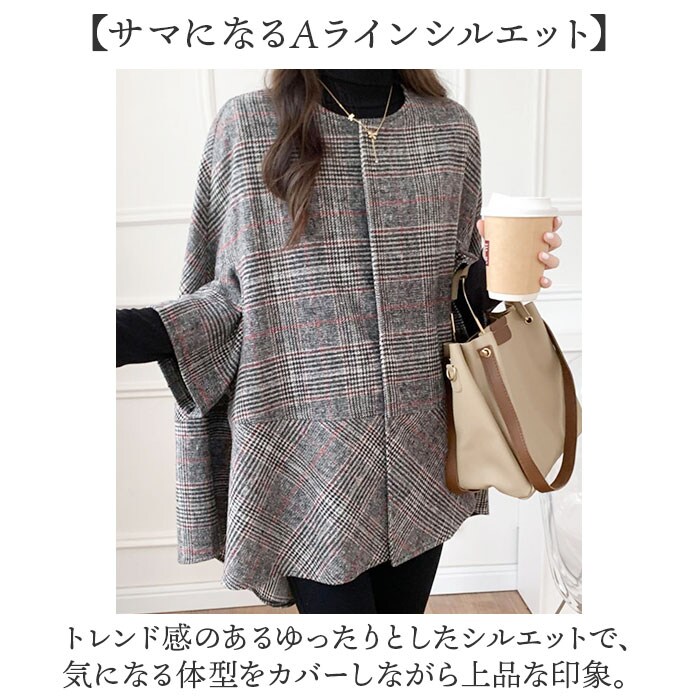 | 商品説明 | 【羽織るだけで、こなれ感アップ】ゆったりとしたポンチョシルエットで、いつものコーデがおしゃれに決まる一枚。【サマになるAラインシルエット】トレンド感のあるゆったりとしたシルエットで、気になる体型をカバーしながら上品な印象。【ボタンを閉めれば防寒対策に】フロントのボタンで着こなしの幅が広がり、秋冬の冷たい風をしっかりシャットアウト。【腕周りもゆったりのドルマンスリーブ】インナーを選ばず、袖にボリュームのあるニットやトップスも楽々重ねられるデザイン。【軽やかで柔らかな着心地】重すぎないライトな着心地で、肩への負担が少なくさらっと羽織れる軽やかさ。【デイリーユースに活躍】落ち着いたチェック柄が、いつものコーディネートに季節感をプラスするアクセント。 |
