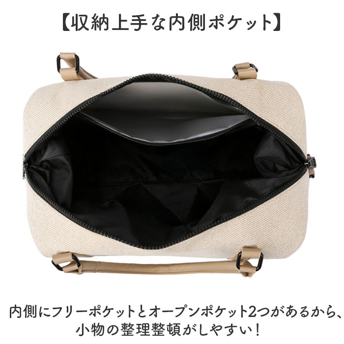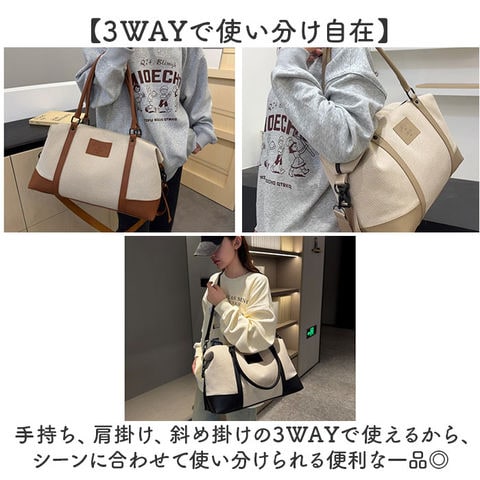 | 商品説明 | 【多機能ボストンバッグ】旅行にも便利、大容量で収納力抜群のボストンバッグ。【3WAYで使い分け自在】手持ち、肩掛け、斜め掛けの3WAYで使えるから、シーンに合わせて使い分けられる便利な一品◎【キャリーオンで移動楽々】キャリーケースに通せるから、旅行時の移動もスマートに負担を軽減できる〇【形を変えられるベルト付き】サイドのベルトで形を調整できるから、荷物の量に合わせて使える♪【収納上手な内側ポケット】内側にフリーポケットとオープンポケット2つがあるから、小物の整理整頓がしやすい!【雨の日も安心】内側のファスナーポケット内は撥水加工が施されているから濡れたものも入れられる。 |