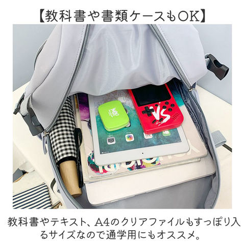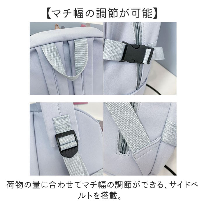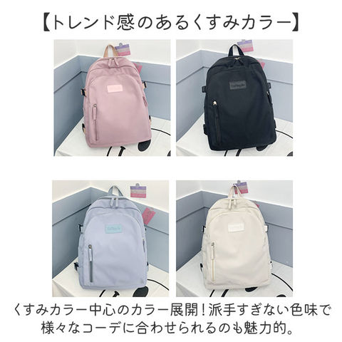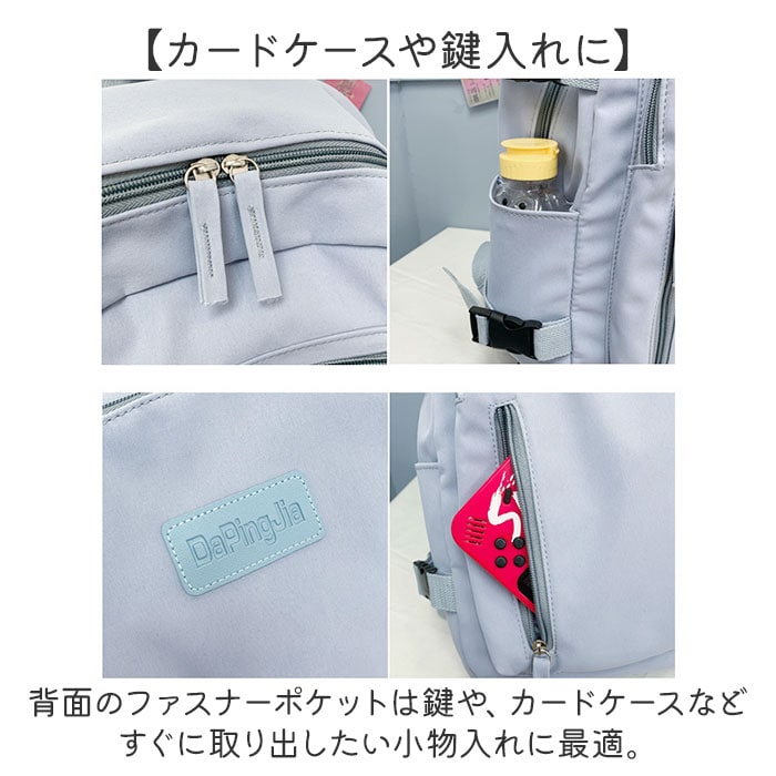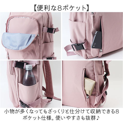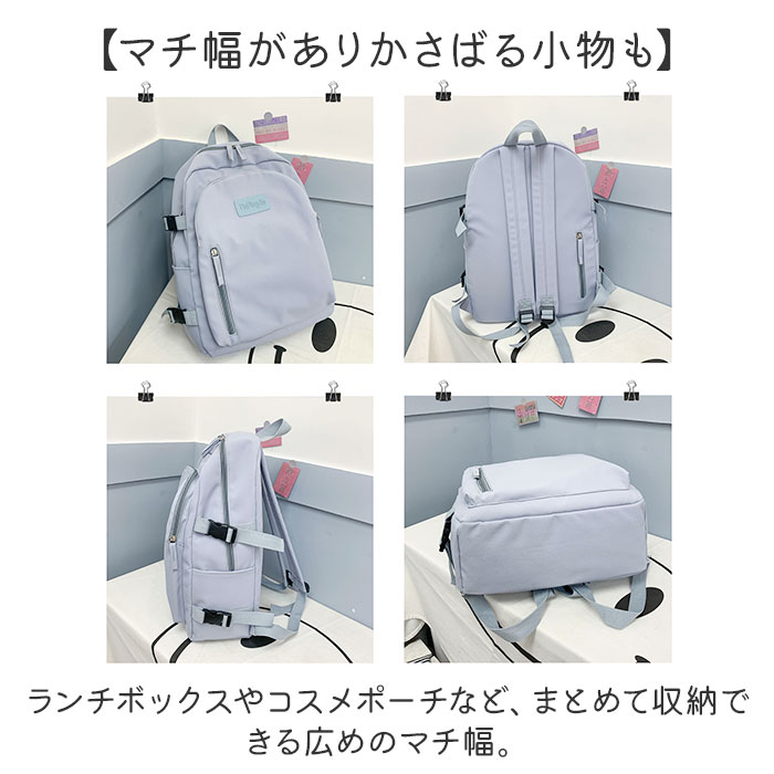 | 商品説明 | 【くすみカラーが可愛い】・1つで様々なコーデに対応◎くすみカラー&シンプルなデザインのリュック。【トレンド感のあるくすみカラー】くすみカラー中心のカラー展開!派手すぎない色味で様々なコーデに合わせられるのも魅力的。【便利な8ポケット】小物が多くなってもざっくりと仕分けて収納できる8ポケット仕様。使いやすさも抜群♪【タブレット・PCを入れても】メイン収納の大きいポケットはクッション入りなので、ノートPCやタブレットの収納にも!【教科書や書類ケースもOK】教科書やテキスト、A4のクリアファイルもすっぽり入るサイズなので通学用にもオススメ。【マチ幅がありかさばる小物も】ランチボックスやコスメポーチなど、まとめて収納できる広めのマチ幅。【カードケースや鍵入れに】背面のファスナーポケットは鍵や、カードケースなどすぐに取り出したい小物入れに最適。【マチ幅の調節が可能】荷物の量に合わせてマチ幅の調節ができる、サイドベルトを搭載。【さりげないアクセント】フロントにはリュックと同色のロゴパッチ付き。異素材コンビでさりげないアクセントに。【デイリーユースにピッタリ】軽く丈夫なポリエステル製のリュック。毎日使えて幅広いシーンに対応☆【ポケット仕様】メインルーム・・・オープンポケット×3(内1つクッション入り)フロント・・・ファスナーポケット×2背面・・・ファスナーポケット×1両サイド・・・オープンポケット×1ずつ |