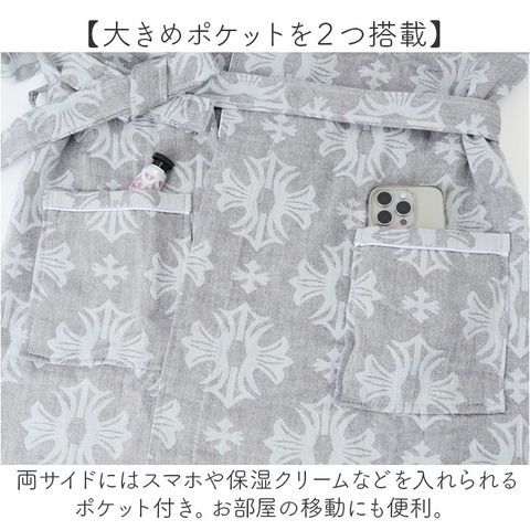 | 商品説明 | 【ふわふわで優しい着心地】綿100%の高密度2重ガーゼのバスローブ♪【オールシーズン対応】通気性、速乾性も優れ、汗をかく季節も快適に着用できる◎【大きめポケットを2つ搭載】両サイドにはスマホや保湿クリームなどを入れられるポケット付き。お部屋の移動にも便利。【多彩なシーンで使える】自宅でのリラックスタイムから温泉旅行まで幅広く活躍◎ |