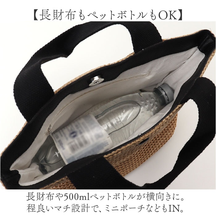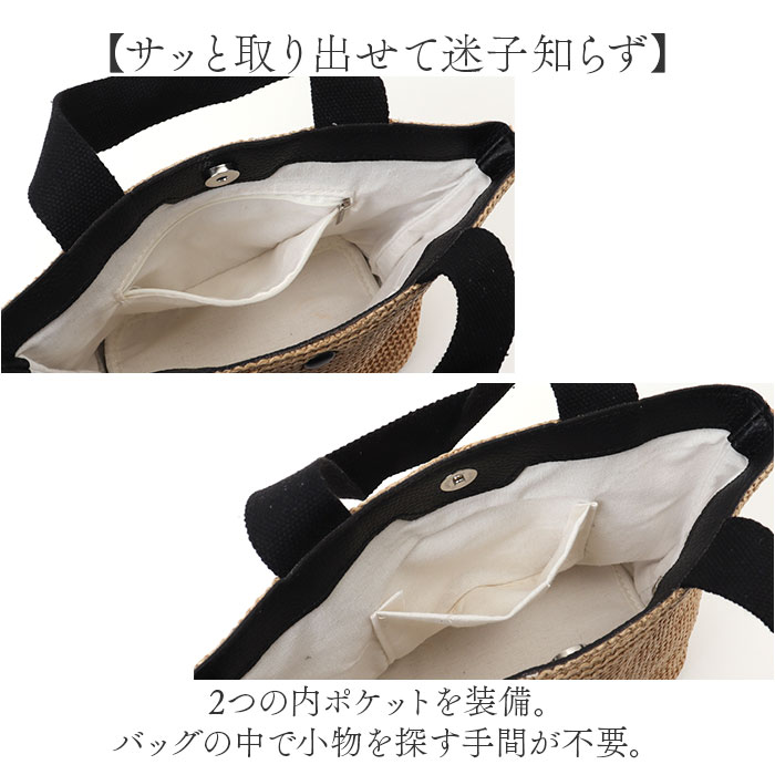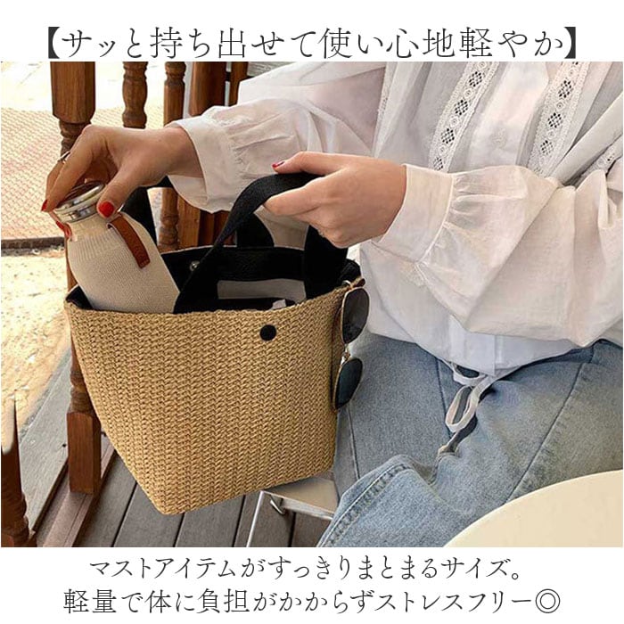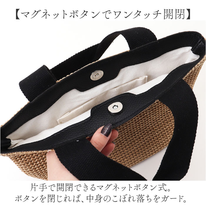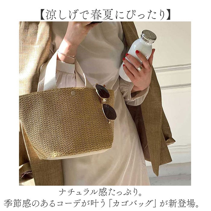 | 商品説明 | 【涼しげで春夏にぴったり】ナチュラル感たっぷり。季節感のあるコーデが叶う「カゴバッグ」が新登場。【サッと持ち出せて使い心地軽やか】マストアイテムがすっきりまとまるサイズ。軽量で体に負担がかからずストレスフリー◎【マグネットボタンでワンタッチ開閉】片手で開閉できるマグネットボタン式。ボタンを閉じれば、中身のこぼれ落ちをガード。【長財布もペットボトルもOK】長財布や500mlペットボトルが横向きに。程良いマチ設計で、ミニポーチなどもIN。【底板を使って安定感をプラス】取り外し可能な底板付き。荷物を安定した状態で持ち運び!【サッと取り出せて迷子知らず】・2つの内ポケットを装備。バッグの中で小物を探す手間が不要。【コーデを選ばないナチュラル感】落ち着きのあるデザインで、カジュアルにもキレイめにも素敵にマッチ。【ポケット仕様】内側:オープンポケット×1、ファスナーポケット×1 |