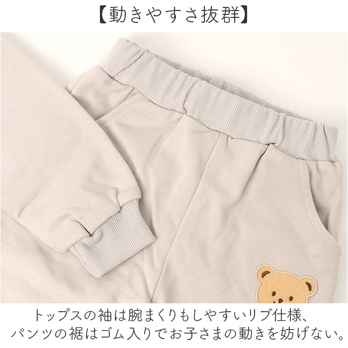 | 商品説明 | 【おしゃれキッズにぴったり】これだけで可愛らしいコーデが完成♪「くまスウェット キッズ 上下セット」。【着回し力ばっちりな2点セット】一緒に合わせるのはもちろん、手持ちの服と組み合わせてコーデの幅が広がる◎【癒やしのクマさん】トップスとパンツにあるクマさんのワッペンがワンポイント。愛らしい表情に思わずほっこり。【重ね着風デザイン】裾から見える切り替えが重ね着したみたいでキュート♪【長く使える薄手の生地】季節問わず使える肌触りのいいコットン素材。たくさん着られるのが嬉しい!【動きやすさ抜群】トップスの袖は腕まくりもしやすいリブ仕様、パンツの裾はゴム入りでお子さまの動きを妨げない。【両サイドポケット付き】ハンカチやティッシュをサッと入れられて通園通学にも大活躍。 |