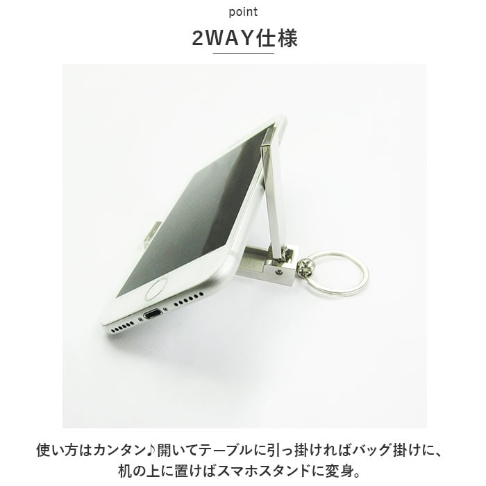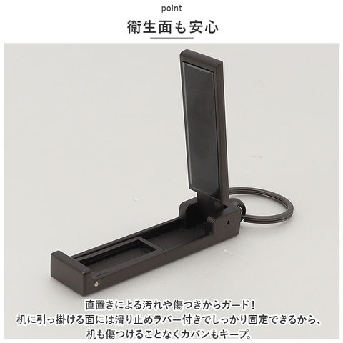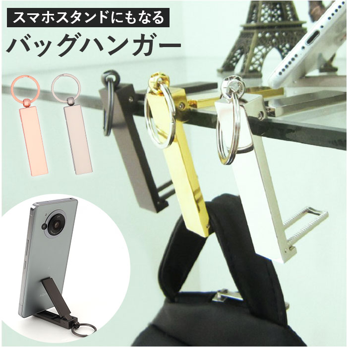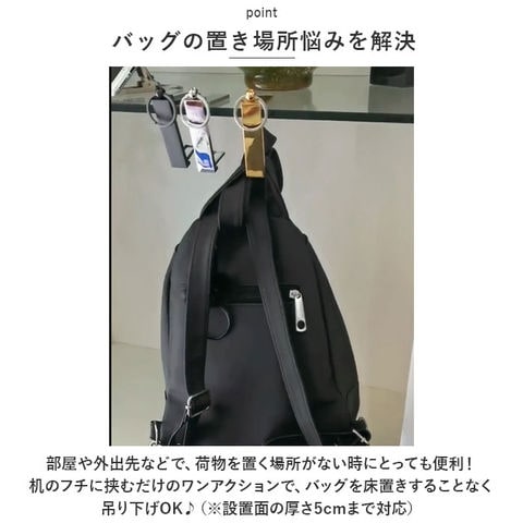 | 商品説明 | コレ一つで「掛けるX立てる」の2WAYアイテム「バックハンガー スマホスタンド」が登場!【2WAY仕様】使い方はカンタン♪開いてテーブルに引っ掛ければバッグ掛けに、机の上に置けばスマホスタンドに変身。【バッグの置き場所悩みを解決】部屋や外出先などで、荷物を置く場所がない時にとっても便利!机のフチに挟むだけのワンアクションで、バッグを床置きすることなく吊り下げOK♪(※設置面の厚さ5cmまで対応)【衛生面も安心】直置きによる汚れや傷つきからガード!机に引っ掛ける面には滑り止めラバー付きでしっかり固定できるから、机も傷つけることなくカバンもキープ。【色んなシーンで大活躍】アウトドアシーンで地面が濡れている時、家の中ではランドセルやカバンの一時置き、ベビーカーのフック代わりにも☆【角度調整自由自在】スマホスタンドで使用する際は、角度の調整が自由自在。重厚感ある金属製で、安定感抜群。【持ち運びラクラク】コンパクト&軽量設計。キーリング付きで、カバンに付けて携帯しやすい♪【選べるカラー】どれも落ち着いたカラー展開。ユニセックスで使えて利用シーンを選ばない◎ |
