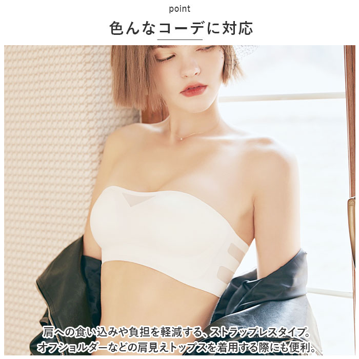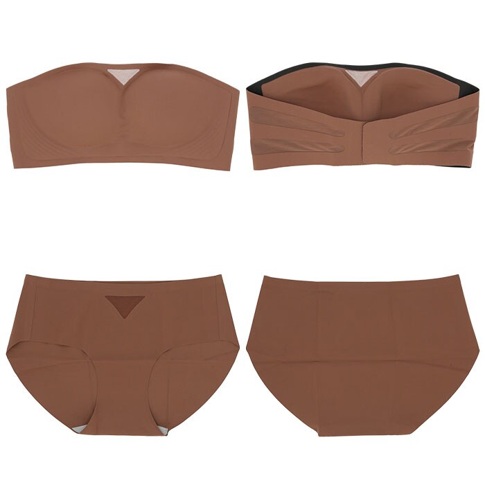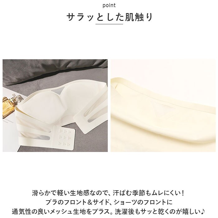 | 商品説明 | バストを心地よくホールド!きれいなシルエットを作り出すブラと、ショーツのセットが新登場。【サラッとした肌触り】滑らかで軽い生地感なので、汗ばむ季節もムレにくい!ブラのフロント&サイド、ショーツのフロントに通気性の良いメッシュ生地をプラス。洗濯後もサッと乾くのが嬉しい♪【デイリー使いにぴったり】シンプルなワンカラーの無地デザイン。凹凸のある装飾を控えており、アウターに響くにくいのもポイント。《ブラジャー》【締めつけ感のないノンワイヤータイプ】窮屈感が苦手な方にぴったり!ストレスフリーな付け心地。【バストのカタチをキープ】バストをしっかり包み込む、もっちりとしたカップ設計。カップ内蔵型なので、いや~なズレも防止。【脇高設計】バストの揺れを抑えて横流れを防止。背中もキレイ魅せ!【こだわりのデザイン】・1枚の生地をモールド加工し、土台まで一体となったモールドカップ仕様。谷間が目立ちにくいデザインで、インナーとしても安心。【色んなコーデに対応】肩への食い込みや負担を軽減する、ストラップレスタイプ。オフショルダーなどの肩見えトップスを着用する際にも便利。【4段階サイズ調節OK】背面ホックで簡単着脱。自分サイズにフィット。《ショーツ》【誰でも使いやすいベーシックデザイン】お尻を優しく包み込んでくれる、ベーシックなカタチ◎クロッチ部分は安心の二重構造。 |