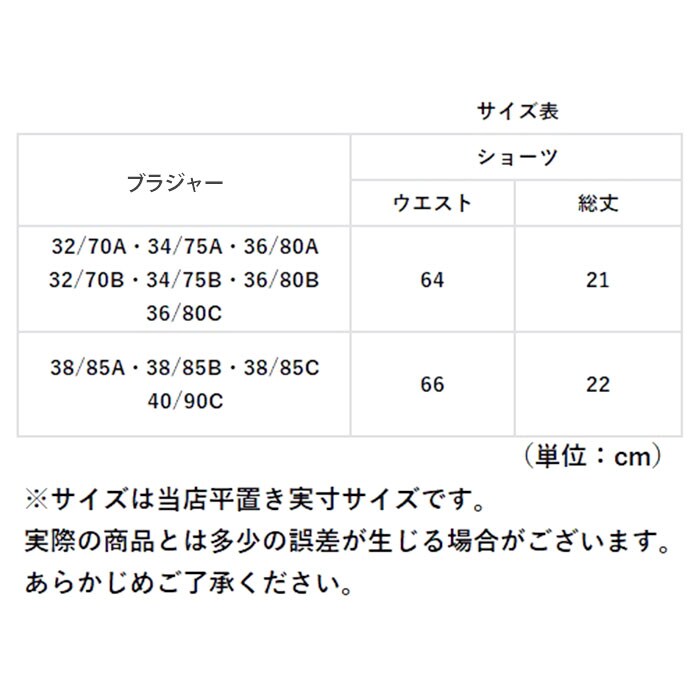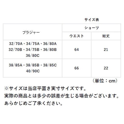 | サイズ | [32/70A]/[34/75A]/[36/80A] [38/85A]/[32/70B]/[34/75B] [36/80B]/[38/85B]/[36/80C] [38/85C]/[40/90C] ※サイズについて詳細は、商品画像の中にあるサイズ表をご覧くださいませ。 |