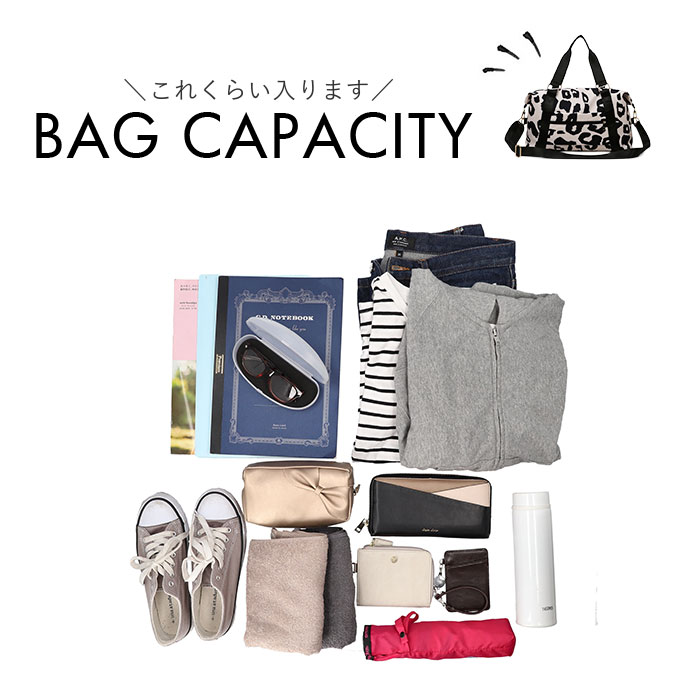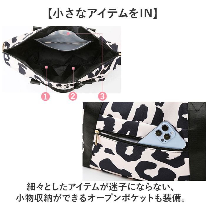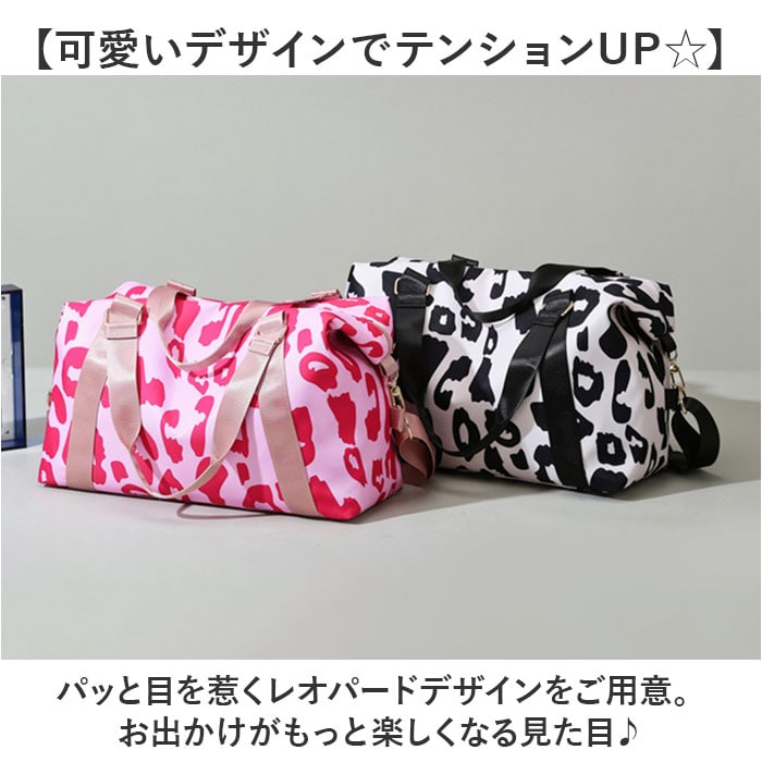 | 商品説明 | 【可愛い見た目と機能性アリ◎】普段使いはもちろん、旅行でも活躍☆大容量なボストンバッグが新発売。【旅行、ジムにぴったりな大容量】ざっくり入る大容量サイズだから、旅行の荷物、ジムなどのスポーツ用品もラクラク収納。【濡れた物を入れられるポケット】メイン収納には、撥水生地を使ったポケットを搭載。濡れたタオルやアメニティなどをIN!【小さなアイテムをIN】細々としたアイテムが迷子にならない、小物収納ができるオープンポケットも装備。【ハンドル付き】サッと持ち出したい時や手持ちスタイルに便利なハンドル付き。【斜め掛けもOK】さらに付属のショルダーベルトは長さ調節ができ、持ち運びやすい斜め掛けも可能。【便利なキャリーオン機能】キャリーバッグの取手に通せる、ベルトつき!ポケットにスマホやパスケースが入るのも◎【撥水生地で汚れや雨に強い】外生地にも撥水加工をON。突然の雨でも慌てなくてOK!汚れにも強いのが嬉しいポイント。※撥水機能は完全に防水するものではありません【可愛いデザインでテンションUP☆】パッと目を惹くレオパードデザインをご用意。お出かけがもっと楽しくなる見た目♪【ポケット仕様】メインルーム・・・オープンポケット×2、ファスナーポケット×1(撥水内生地)背面・・・ファスナーポケット×1 |