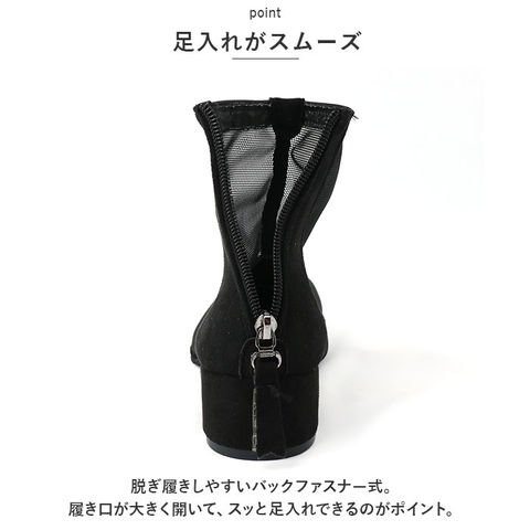 | 商品説明 | シアー感漂う大人な仕上がり。春夏コーデにプラスできる、ブーツサンダルが新登場。【涼しげなサマーブーツ】透け感のあるメッシュ素材&手触りなめらかなPU素材をミックス。メッシュ素材を広範囲に使うことで通気性が良く、汗ばむ季節も快適。【足入れがスムーズ】脱ぎ履きしやすいバックファスナー式。履き口が大きく開いて、スッと足入れできるのがポイント。【適度な高さで安定感もキープ】ヒール部分は安定感のある幅広設計。足に負担をかけることなく、スタイルアップ効果も♪【歩きやすさが向上】つま先が上を向いたトゥスプリング設計でつまづきにくく、蹴り上げやすい!つま先からかかとまで覆われているから、移動時も安心。【コーデに馴染むカラー】どんなスタイルにマッチする、ベーシックカラーをラインナップ。スタイリッシュにキマり、適度な肌見せも叶うアイテム♪ |
