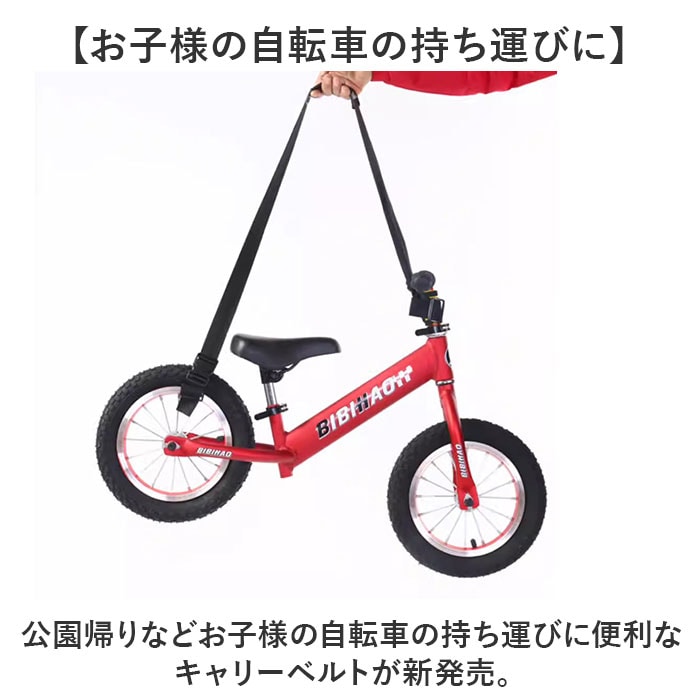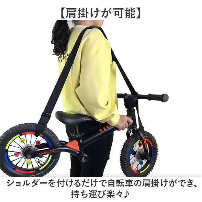 | 商品説明 | 【お子様の自転車の持ち運びに】公園帰りなどお子様の自転車の持ち運びに便利なキャリーベルトが新発売。【肩掛けが可能】ショルダーを付けるだけで自転車の肩掛けができ、持ち運び楽々♪【肩に負担が掛かりにくい】ベルト部分に肩パッドを装備し、肩への負担を軽減。ズレない滑り止め付きなのも◎【取り付け簡単】持ち上げたい箇所にベルトを通してフックに留めるだけ☆ワンタッチで留めるカラビナタイプ。【コンパクトに収納】使わないときは小さくたためて携帯にも便利!バッグに入れて持ち歩ける。【パパさんも使いやすい】黒のワンカラー仕様で、パパさんも使いやすい見た目◎アジャスターで長さ調節も可能。 |