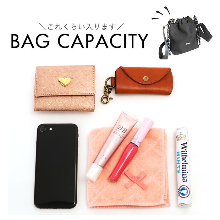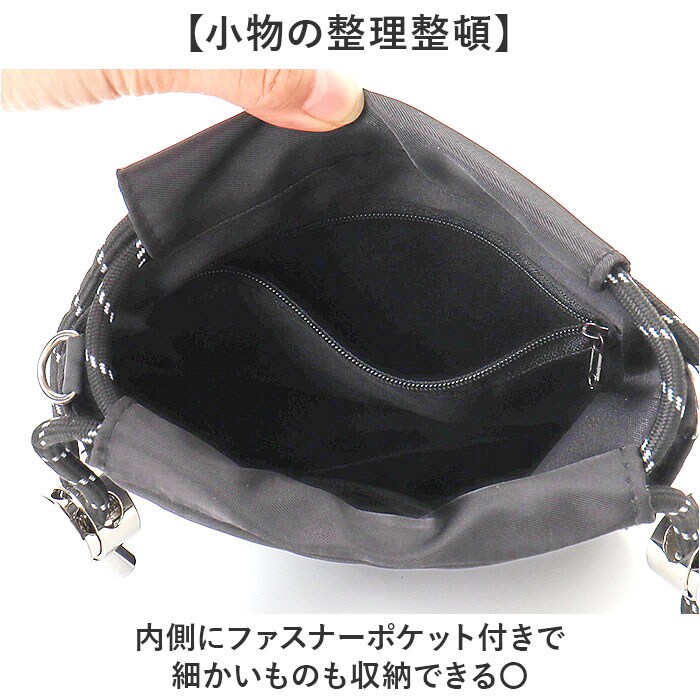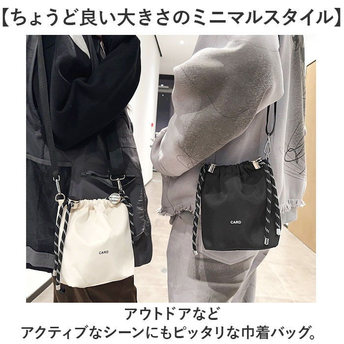 | 商品説明 | 【ちょうど良い大きさのミニマルスタイル】アウトドアなどアクティブなシーンにもピッタリな巾着バッグ。【身軽におでかけ】スマホやミニ財布など必需品が入れられるサイズ感♪【立体感がかわいい】巾着のドローストリング仕様でフォルムを変えられる。【肩掛けも斜め掛けも自由】調節可能なショルダー付きで持ち方選べる◎【小物の整理整頓】内側にファスナーポケット付きで細かいものも収納できる〇【軽い素材で使いやすい】ナイロン素材使用で軽量かつ、撥水効果で少しの雨なら大丈夫◎ |