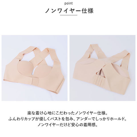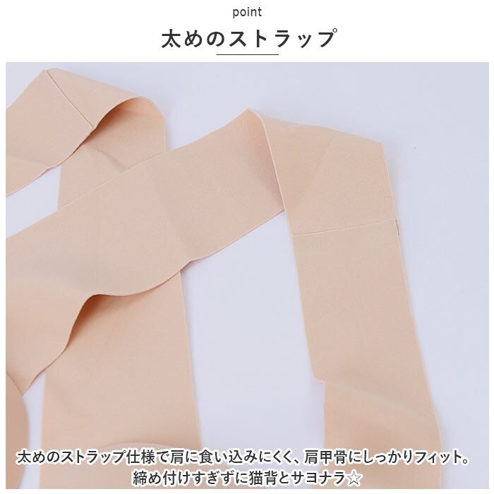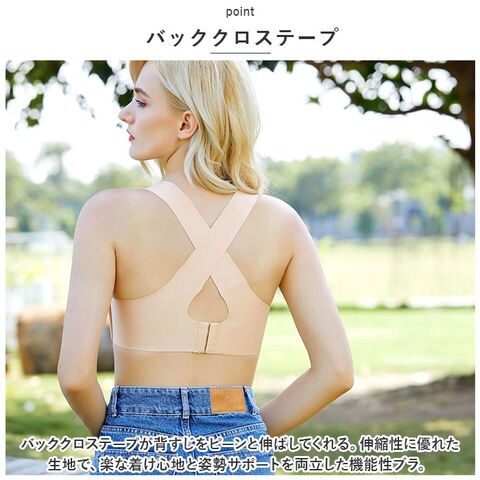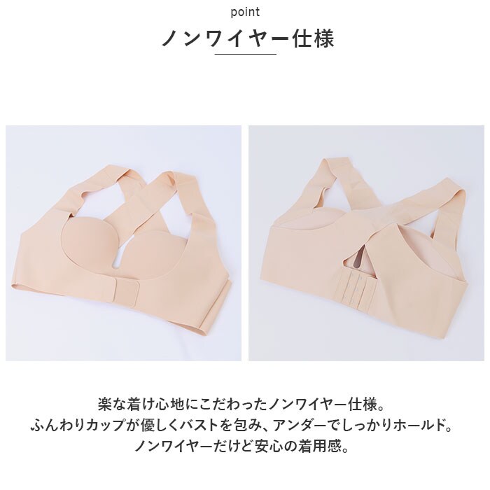 | 商品説明 | クロスストラップで姿勢をサポートして、ノンワイヤーのカップで優しくバストを包む♪「ブラジャー クロスストラップ」が登場。【バッククロステープ】バッククロステープが背すじをピーンと伸ばしてくれる。伸縮性に優れた生地で、楽な着け心地と姿勢サポートを両立した機能性ブラ。【ギュッと寄せる】フロント部分の面ファスナーで、アンダーをギュッと寄せてバストアップができる。美胸ラインをキレイに強調♪【3段ホック】4列で3段のしっかりめのホックを搭載。サイズの調節ができるのでフィット感がUP!脇高設計でしっかりホールド。【ノンワイヤー仕様】楽な着け心地にこだわったノンワイヤー仕様。ふんわりカップが優しくバストを包み、アンダーでしっかりホールド。ノンワイヤーだけど安心の着用感。【太めのストラップ】太めのストラップ仕様で肩に食い込みにくく、肩甲骨にしっかりフィット。締め付けすぎずに猫背とサヨナラ☆ |