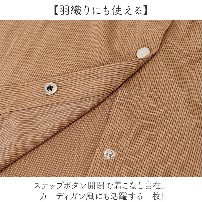 | 商品説明 | 【薄手コーデュロイの万能ブラウス】オーバーサイズの秋冬主役トップス。【こなれ見えシルエット】体型カバーも叶う、今っぽさ満点のシルエット♪【リブ袖がポイント】袖口のリブ仕様が抜け感を演出し、スタイリングにメリハリをプラス◎【羽織りにも使える】スナップボタン開閉で着こなし自在、カーディガン風にも活躍する一枚!【薄手生地で重ね着自在】薄手のコーデュロイ素材だから、インナー次第で秋から冬まで長く着回せる♪【軽やかな着心地】見た目以上に軽く快適な着用感で、一日中ストレスフリーに過ごせる。 |