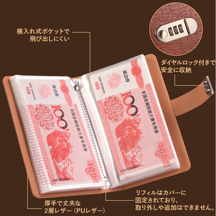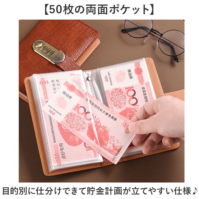 | 商品説明 | 【大切な貯金を守る】ダイヤルロック付きで安心してお札を貯められる手帳型ファイル。【最大100枚収納】お札やカードをたっぷり保管できる大容量タイプ◎【50枚の両面ポケット】目的別に仕分けできて貯金計画が立てやすい仕様♪【3桁ダイヤルロック】大切な貯金を守るセキュリティ機能付きで安心〇【スマートな背表紙設計】中身が増えても膨らみにくく美しいフォルムをキープ。【型押し加工の上質感】アンティーク調ダイヤルとクロコ風素材が高級感を演出。【コンパクトサイズ】A6サイズで引き出しやカバンにすっきり収まる! |