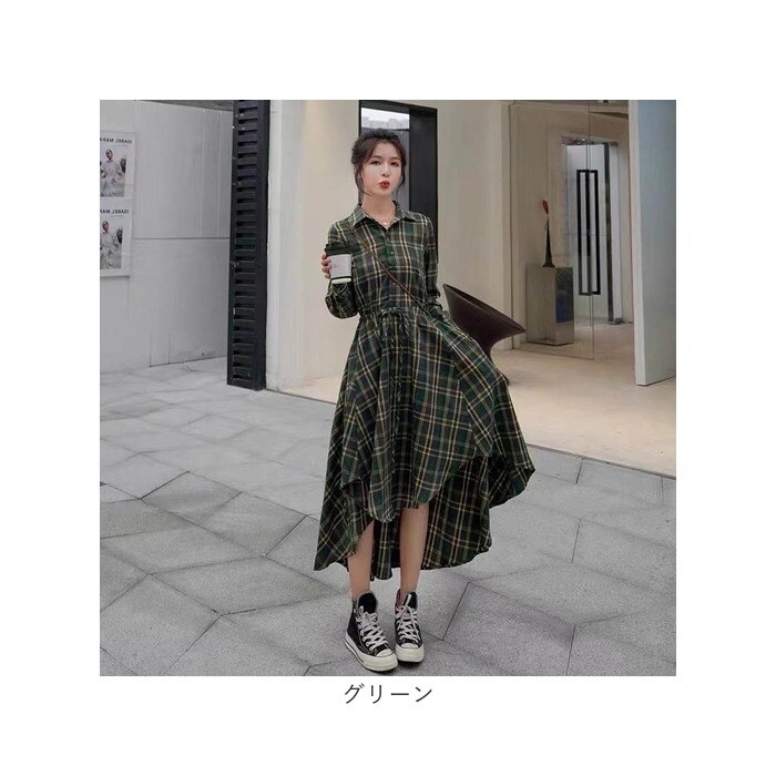 シャツワンピース フィッシュテール チェック柄【グリーン】【Lサイズ】のレビュー