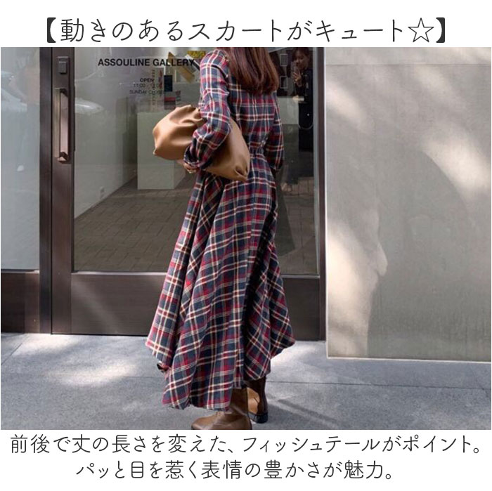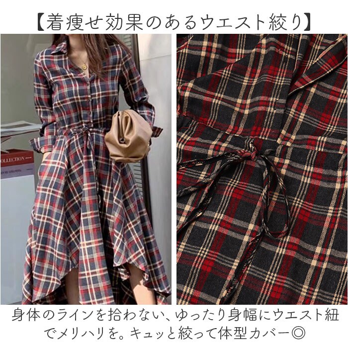 商品説明【フィッシュテールで表情豊かに♪】秋冬のシーズン感UP☆チェックデザインが魅力。シャツワンピース フィッシュテール が登場。【動きのあるスカートがキュート☆】前後で丈の長さを変えた、フィッシュテールがポイント。パッと目を惹く表情の豊かさが魅力。【着痩せ効果のあるウエスト絞り】身体のラインを拾わない、ゆったり身幅にウエスト紐でメリハリを。キュッと絞って体型カバー◎【秋冬の定番、チェックデザイン!】シーズン感を高める、定番チェック☆季節の変わり目から寒くなったらタイツや羽織を合わせて◎【サラっと軽い着心地でラクチン】やわらかな生地を採用。厚みもほどよく、軽い着心地なので1日着てもストレスフリー。