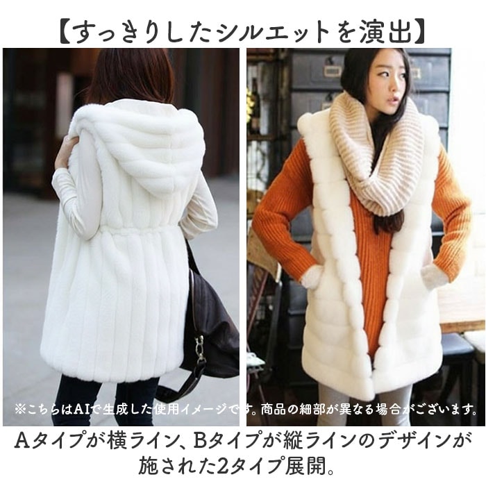| 商品説明 | 【羽織るだけで華やかに】秋冬コーデが一気に主役級♪「レディース ファーベスト 」。【頼れる暖かさ】手持ちのトップスに羽織るだけ!フード付きで防寒性もしっかり確保◎【腕周りゆったり快適】アームホールにゆとりがあるから、少し厚手のニットとの重ね着もできる。【程よいボリューム感】肌触りの良いフェイクファー素材。見た目の華やかさと暖かさを両立。【軽くてあたたかい】安心の裏地付き。適度な保温性があるから肌寒い季節に大活躍。【すっきりしたシルエットを演出】Aタイプが横ライン、Bタイプが縦ラインのデザインが施された2タイプ展開。【便利なポケット】両サイドにはポケット付き。【存在感抜群】1枚でスタイリングをアップデート!カジュアルにもきれいめコーデにも合わせられるアイテム。 |