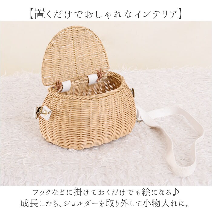| 商品説明 | 【用途を変えて楽しめるアイテム】使い方いろいろ!大きくなっても長く楽しめる「キッズ用カゴバッグ」。【ナチュラルな雰囲気たっぷり】柳素材などを使い、自然な質感を残したカゴバッグ。ころんと可愛らしい、ミニサイズ。【お好みに合わせてスタイルチェンジ】ショルダーの長さを調節して取り付け方を変えると、斜め掛けやリュックとして活躍!(※)ショルダーは取り外し可能です。リュックとして使用する場合、動くとフタが開いてしまう可能性もあるため、ご注意ください。【三輪車のカゴ代わりに使ってもOK】面ファスナー式の短いテープを使い、三輪車のフレームに取り付けも可能。【置くだけでおしゃれなインテリア】フックなどに掛けておくだけでも絵になる♪成長したら、ショルダーを取り外して小物入れに。【お気に入りを選べるカラー】優しい風合いのカラーをラインナップ。コーデのアクセント使いにもおすすめ。 |