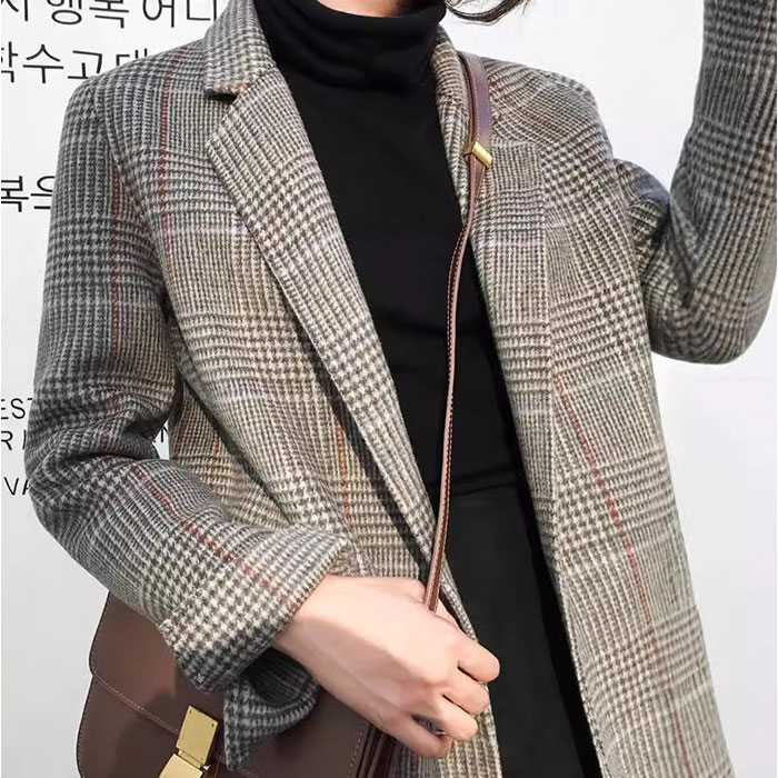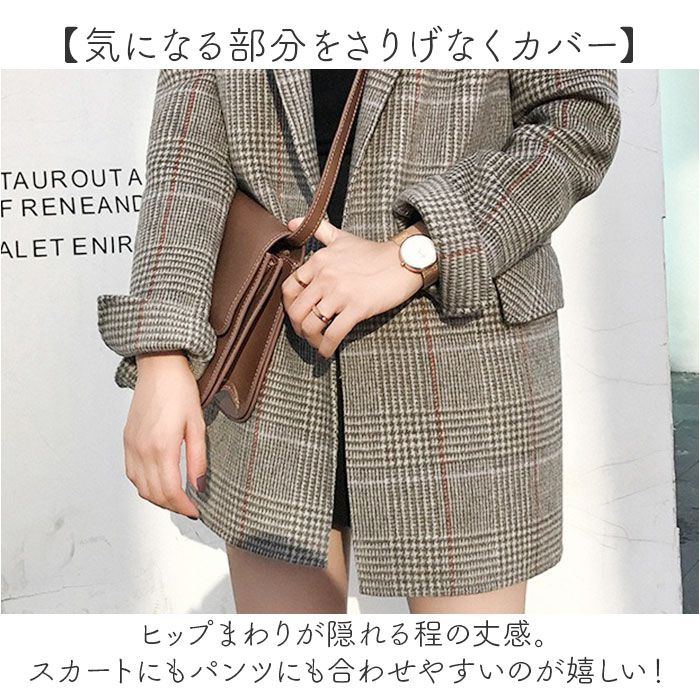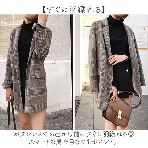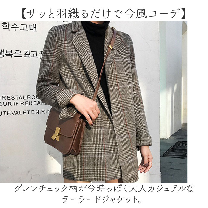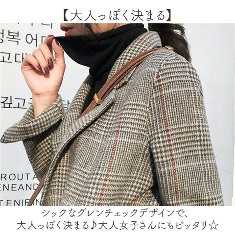 | 商品説明 | 【サッと羽織るだけで今風コーデ】グレンチェック柄が今時っぽく大人カジュアルなテーラードジャケット。【様々なシーンで活躍】襟付きとしっかりとした厚手の生地でラフ過ぎず、きれいめコーデやオフィス用にもオススメ♪【すぐに羽織れる】ボタンレスでお出かけ前にすぐに羽織れる◎スマートな見た目なのもポイント。【大人っぽく決まる】シックなグレンチェックデザインで、大人っぽく決まる♪大人女子さんにもピッタリ☆【気になる部分をさりげなくカバー】ヒップまわりが隠れる程の丈感。スカートにもパンツにも合わせやすいのが嬉しい!【小物を入れておけるポケット】左右にフラップポケットを配置。スマホなどの小物をINできて便利。 |