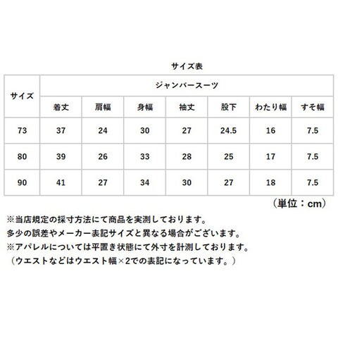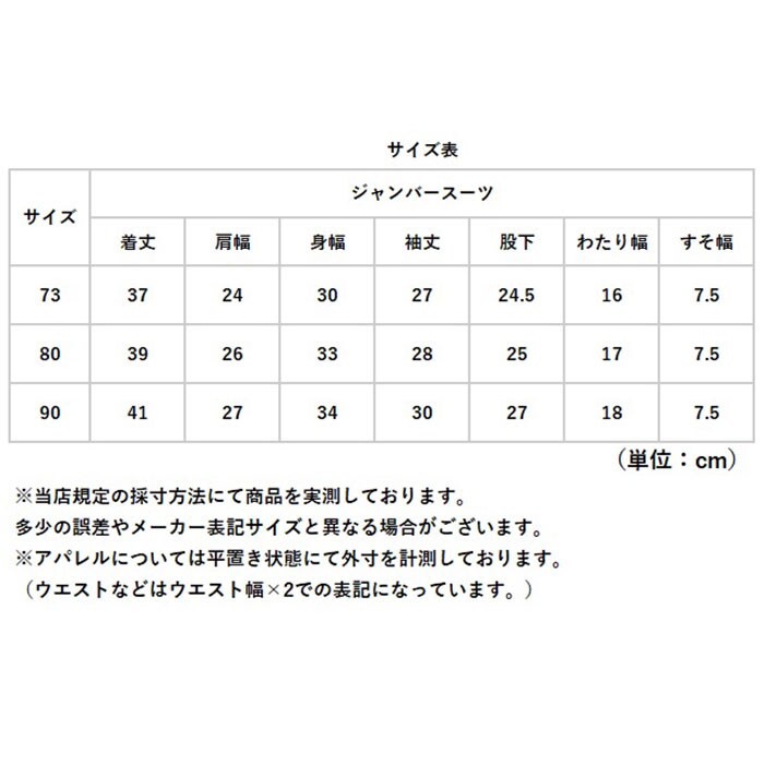 | サイズ | [ベビー] ・73cm ・80cm ・90cm ※サイズについて詳細は、商品画像の中にあるサイズ表をご覧くださいませ。 |