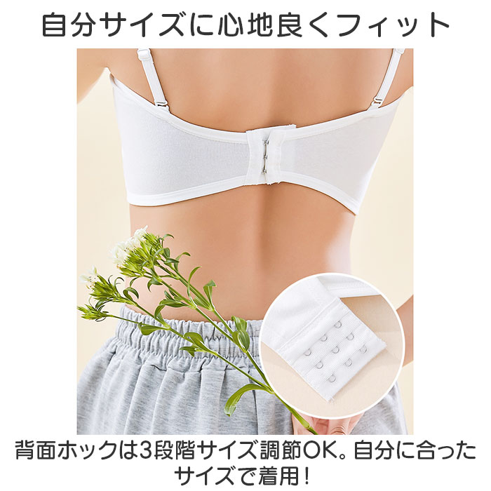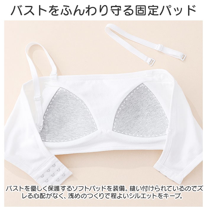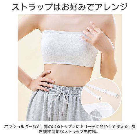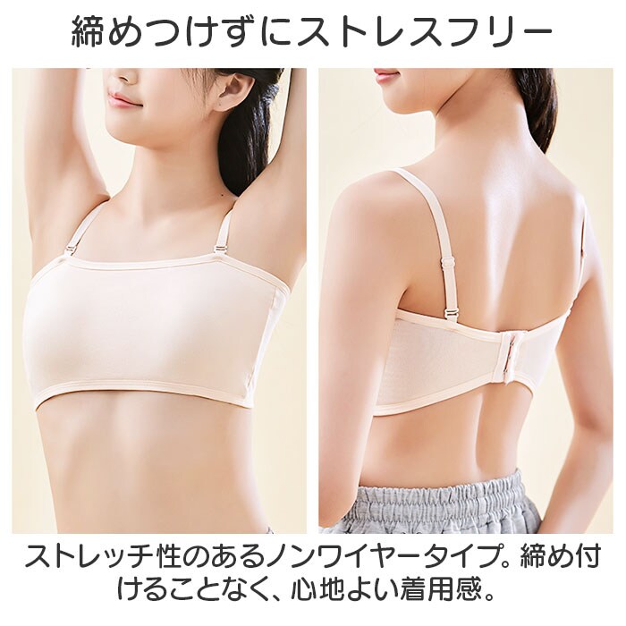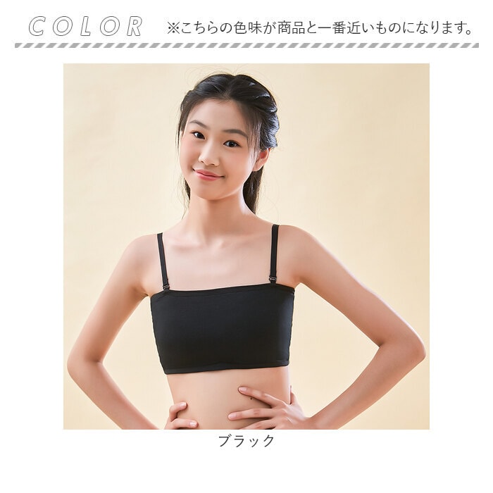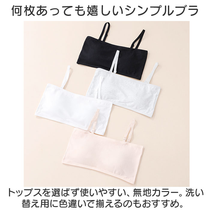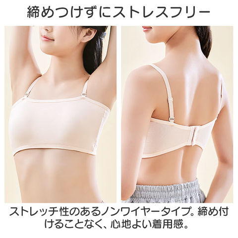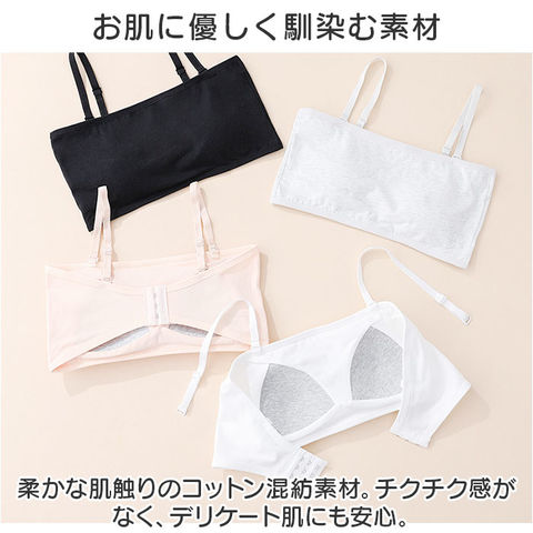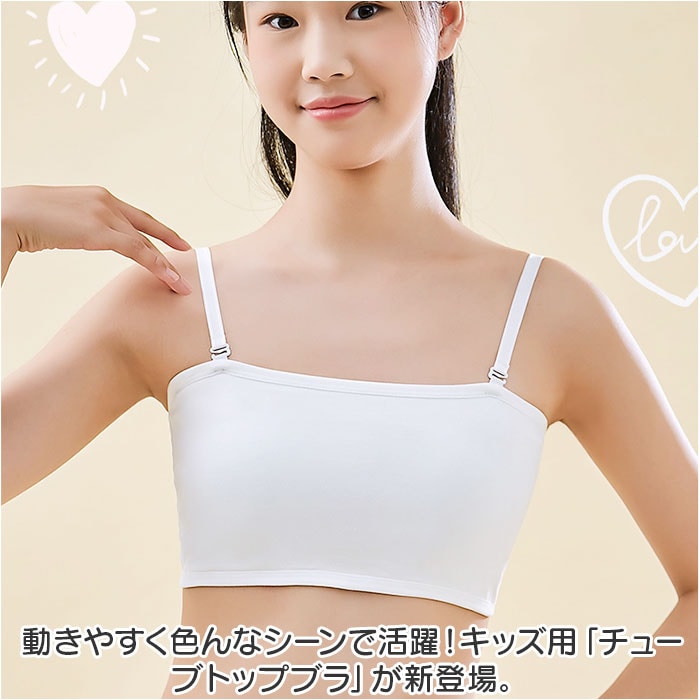 | 商品説明 | 動きやすく色んなシーンで活躍!キッズ用「チューブトップブラ」が新登場。【ダンスなどのアクティブシーンに】バストまわりを包み込む幅広のチューブトップブラ。ダンスや部活など、アクティブに動くシーンにぴったり。【お肌に優しく馴染む素材】柔かな肌触りのコットン混紡素材。チクチク感がなく、デリケート肌にも安心。【締めつけずにストレスフリー】ストレッチ性のあるノンワイヤータイプ。締め付けることなく、心地よい着用感。【バストをふんわり守る固定パッド】バストを優しく保護するソフトパッドを装備。縫い付けられているのでズレる心配がなく、浅めのつくりで程よいシルエットをキープ。【自分サイズに心地良くフィット】背面ホックは3段階サイズ調節OK。自分に合ったサイズで着用!【ストラップはお好みでアレンジ】オフショルダーなど、肩の出るトップスに♪コーデに合わせて使える、長さ調節可能なストラップも付属。【何枚あっても嬉しいシンプルブラ】トップスを選ばず使いやすい、無地カラー。洗い替え用に色違いで揃えるのもおすすめ。 |