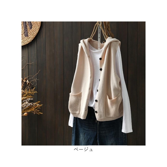 ニットベスト ニットジレ フード付き mmknitv14h【ベージュ】【Lサイズ】