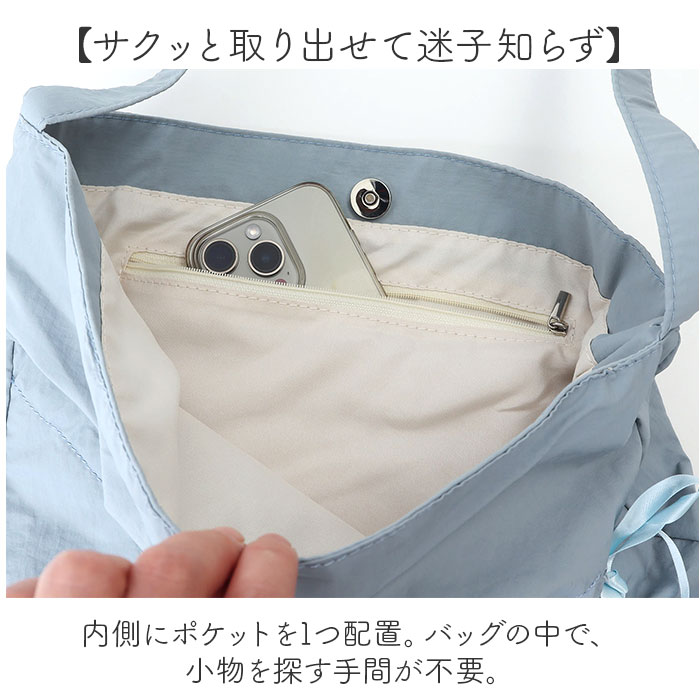 | 商品説明 | 【可愛く持ち歩ける相棒】くしゅっと絞れるリボンがアクセント☆メインもサブ使いもできる「トートバッグ」。【お好みで簡単!アレンジ自在】・2箇所のリボンをくしゅっと調節。荷物の量や気分に合わせて、シルエットチェンジ♪【肩掛けできて移動がラクラク】肩に掛けられる長さのワンハンドル。両手を自由に使えて、ストレスフリー。【マグネット式でワンタッチ開閉】前後ルームは力いらずで簡単◎大きく開いて出し入れしやすく閉じれば中身の飛び出しもガード。【A4対応ですっきりひとまとめ】A4が縦向きにすっぽり。マチのないスリム形状ながら、マストアイテムが収まるサイズ感。【サクッと取り出せて迷子知らず】内側にポケットを1つ配置。バッグの中で、小物を探す手間が不要。【お気に入りを選べるカラー】ベーシックや差し色をラインナップ。コーデを選ばず使える、シンプルで可愛らしい仕上がり。【ポケット仕様】内側:ファスナーポケット×1 |
