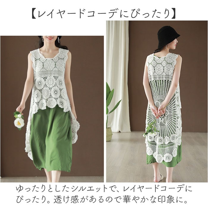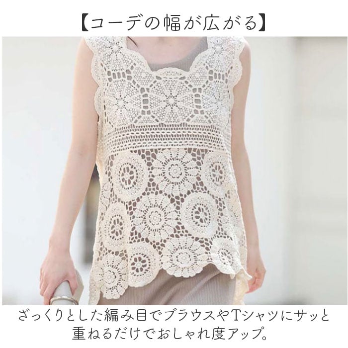 | 商品説明 | 【さらっと軽い着心地】大胆かつ繊細な透かし編みデザイン「ロングベスト レース カジュアル」が登場。【レイヤードコーデにぴったり】ゆったりとしたシルエットで、レイヤードコーデにぴったり。透け感があるので華やかな印象に。【コーデの幅が広がる】ざっくりとした編み目でブラウスやTシャツにサッと重ねるだけでおしゃれ度アップ。【リゾートシーンでも活躍】前後で長さが違うアシメントリーデザイン。水着の上に着用すればリゾート感たっぷり♪【着心地もバツグン】サラっとした肌触りと柔らかいコットンの素材感で、着心地のよさが魅力。動きやすさも◎【ロングシーズン着用OK】インナー次第で暑い季節でも涼やかに。合わせるカラーによっても様々なスタイルが楽しめる! |