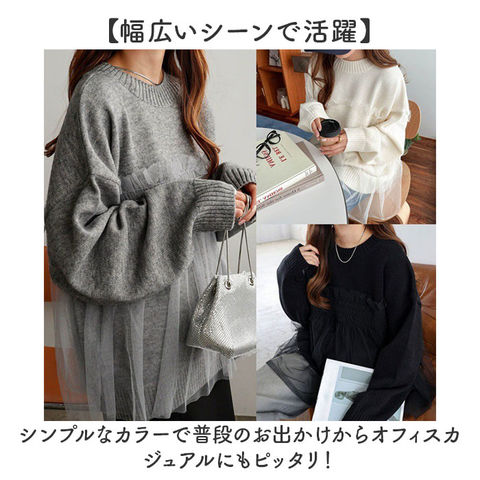 | 商品説明 | 【チュールが可愛いポイント】いつものコーデにトレンド感をプラス♪ふんわりチュールが可愛いドッキングニット。【一枚で様になるニット】チュールとドッキングしたニットで、一枚でトレンドなレイヤードコーデに♪【チュールが可愛くカバー】ふんわりとしたチュールが気になるお腹周りや腰回りを可愛くカバー!【ストレスフリーな着心地】ゆったりとした作りで窮屈感ゼロ。ゆったり着られて、着痩せ効果も叶える優秀シルエット◎【着回し力抜群】カジュアルなパンツにも甘めなスカートにも合わせられ、着回し力があるのもGOOD。【幅広いシーンで活躍】シンプルなカラーで普段のお出かけからオフィスカジュアルにもピッタリ!【特別なお出かけにも】オシャレで可愛い見た目で、デートなど特別なお出かけに着ていくのもオススメ♪ |