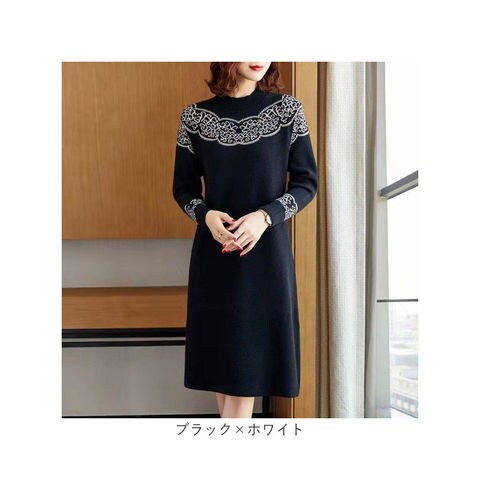 ニットワンピース 体型カバー【ブラック×ホワイト】【Mサイズ】