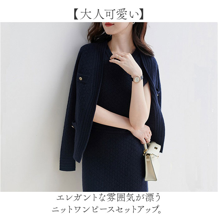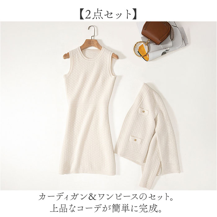 | 商品説明 | 【大人可愛い】エレガントな雰囲気が漂うニットワンピースセットアップ。【2点セット】カーディガン&ワンピースのセット。上品なコーデが簡単に完成。【伸縮性抜群】滑らかな手触りの柔らかい素材でストレスフリーな着心地◎【着回し自在】カーディガン、ワンピースそれぞれ別々に使えるからコーデの幅も広がる。 |