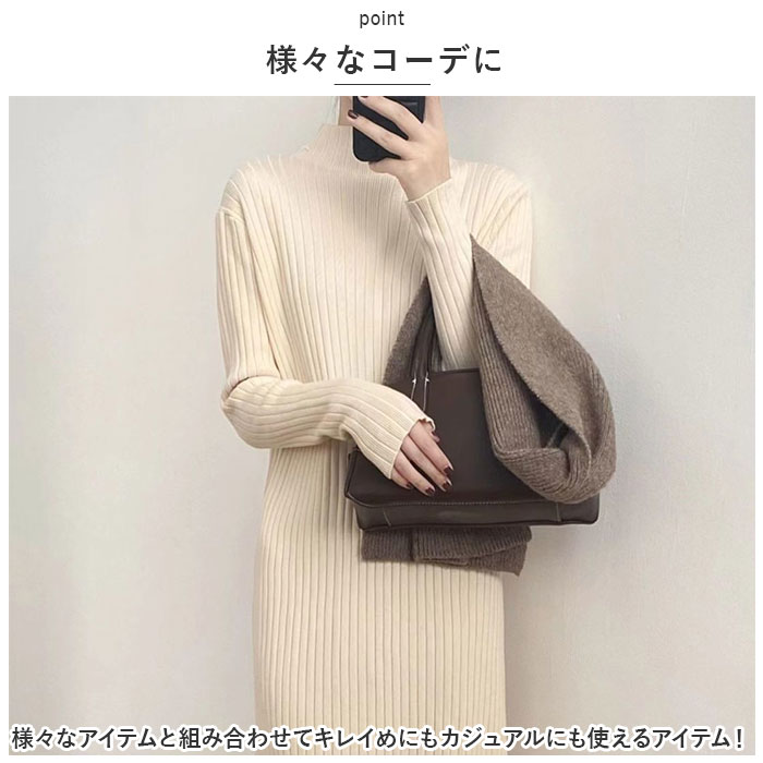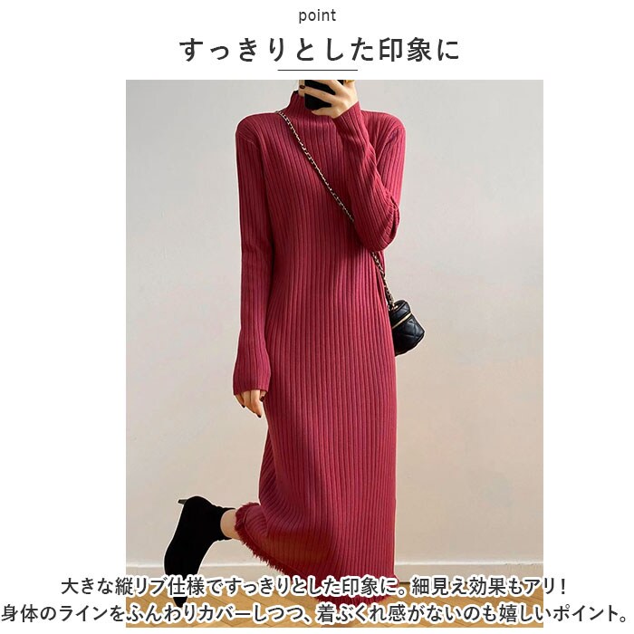 | 商品説明 | ・1枚でコーデが完成♪ロングニットワンピースが発売♪【シンプルデザイン】飽きのこないシンプルな無地デザイン!程よくゆったり感のあるワンピース。【すっきりとした印象に】大きな縦リブ仕様ですっきりとした印象に。細見え効果もアリ!身体のラインをふんわりカバーしつつ、着ぶくれ感がないのも嬉しいポイント。【モックネック】襟元にやや高さのあるモックネックタイプ。ノーカラーのジャケットなどのアウターと相性抜群!【優しい肌触り】スパンデックス素材を使用しているので伸縮性抜群。チクチクしないなめらかで優しい肌触り。【ロング丈】ひざ下くらいまでのロング丈。1枚で着るのはもちろん、お手持ちのレギンスやスキニーパンツと合わせてもOK。【様々なコーデに】様々なアイテムと組み合わせてキレイめにもカジュアルにも使えるアイテム! |