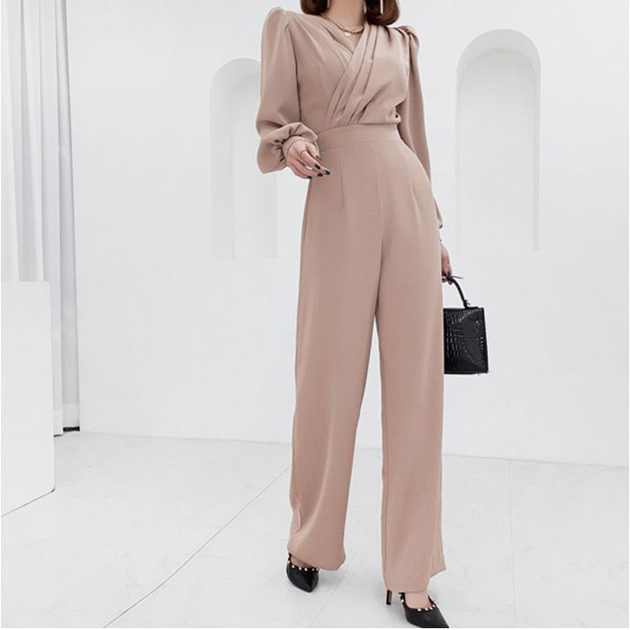 パンツドレス vネック ハイウエストロングパンツ mmpdress14d【ベージュ】【Lサイズ】