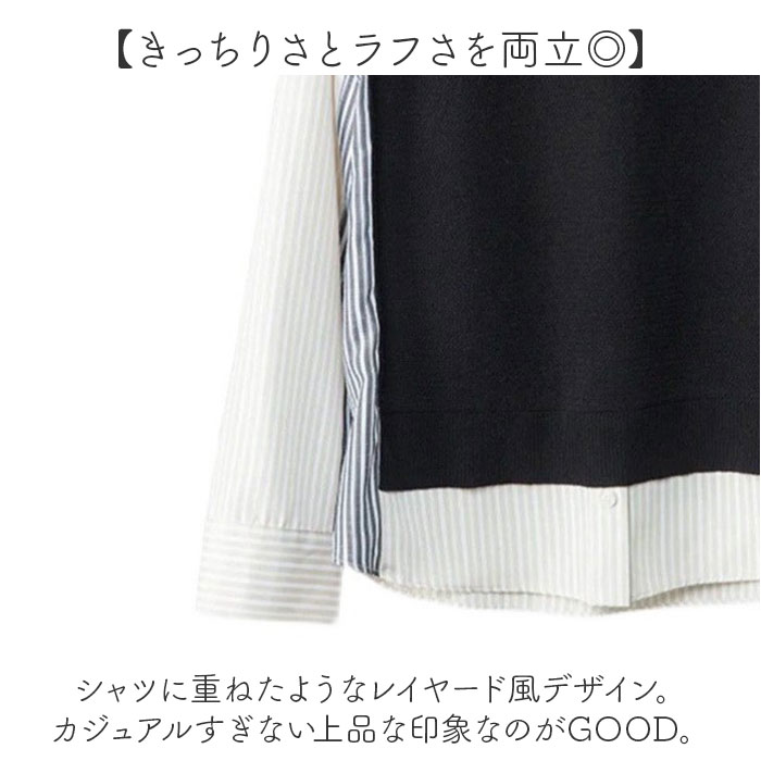| 商品説明 | 【1枚でレイヤード風の着こなし☆】異素材の組み合わせでおしゃれ度UP♪ プルオーバー 重ね着風が登場。【存在感のある主役トップス!】これ1枚着るだけで、おしゃれ上級者のような着こなしに。大人な存在感のある技ありトップス【きっちりさとラフさを両立◎】シャツに重ねたようなレイヤード風デザイン。カジュアルすぎない上品な印象なのがGOOD。【縦ラインで着痩せ効果あり】縦ラインを強調する、ストライプが魅力。細見え効果とおしゃれカラーのストライプがポイント【幅広いシーンに対応できるキャップ】普段使いはもちろん、オフィスやちょっとキレイにしたいお出かけまで。幅広くマッチ。【ロングシーズン活躍する】薄手の長袖なので、春秋だけでなく、冷房の冷えが気になる夏にも活躍! |