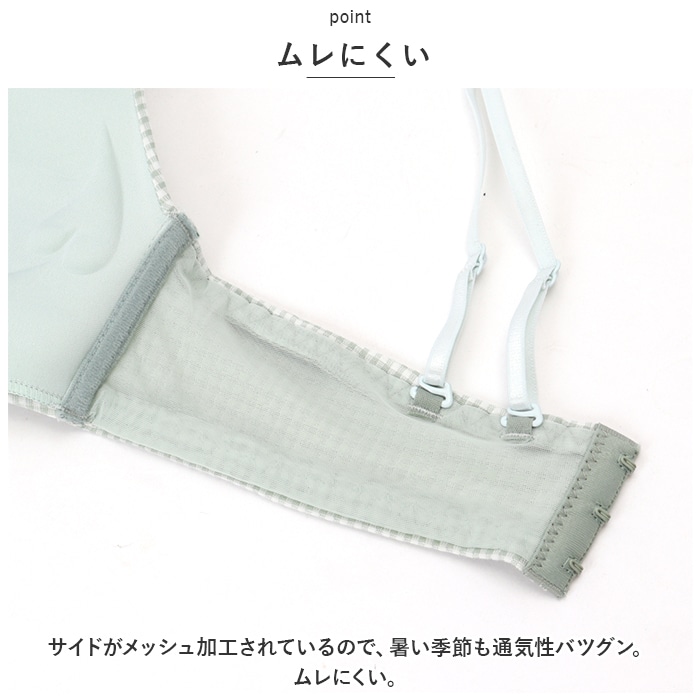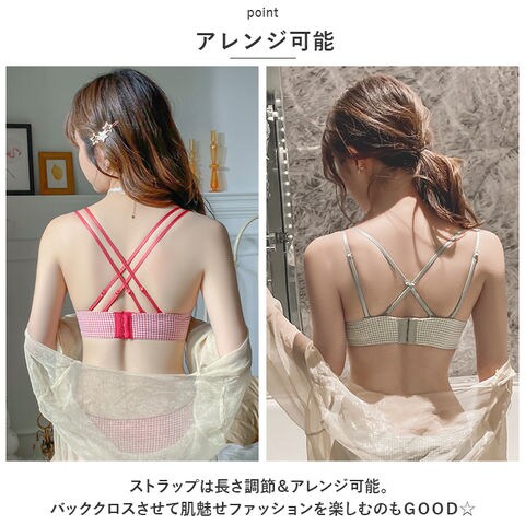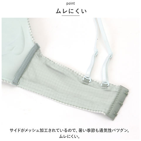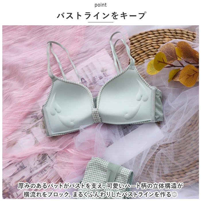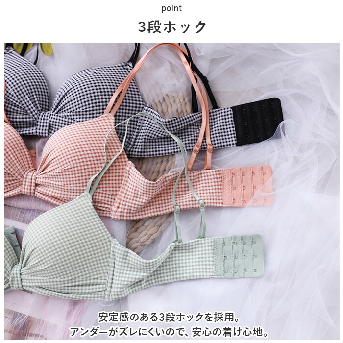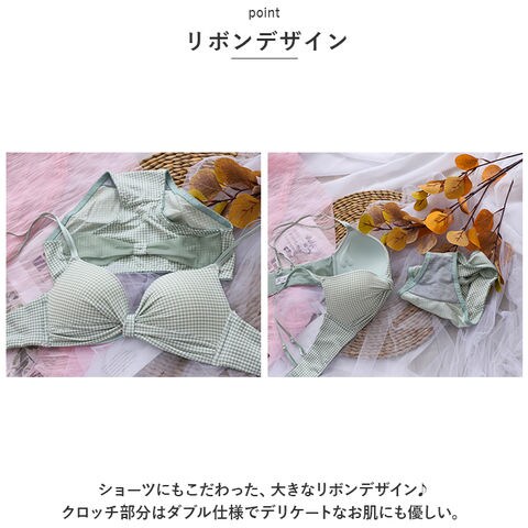 | 商品説明 | ギンガムチェック柄がかわいい♪嬉しい上下セット「ブラジャー&ショーツ」が登場。【気分をUP♪】ギンガムチェック柄がとってもキュート♪可愛いインナーを身に着けて気分をUP!【ふんわり着け心地】ノンワイヤーとふんわり柔らかいパットで、ラクチンな着け心地を実現。1日着けてもストレスフリー。【バストラインをキープ】厚みのあるパットがバストを支え、可愛いハート柄の立体構造が横流れをブロック。まるくふんわりしたバストラインを作る◎【ムレにくい】サイドがメッシュ加工されているので、暑い季節も通気性バツグン。ムレにくい。【アレンジ可能】ストラップは長さ調節&アレンジ可能。バッククロスさせて肌魅せファッションを楽しむのもGOOD☆【3段ホック】安定感のある3段ホックを採用。アンダーがズレにくいので、安心の着け心地。【リボンデザイン】ショーツにもこだわった、大きなリボンデザイン♪クロッチ部分はダブル仕様でデリケートなお肌にも優しい。 |