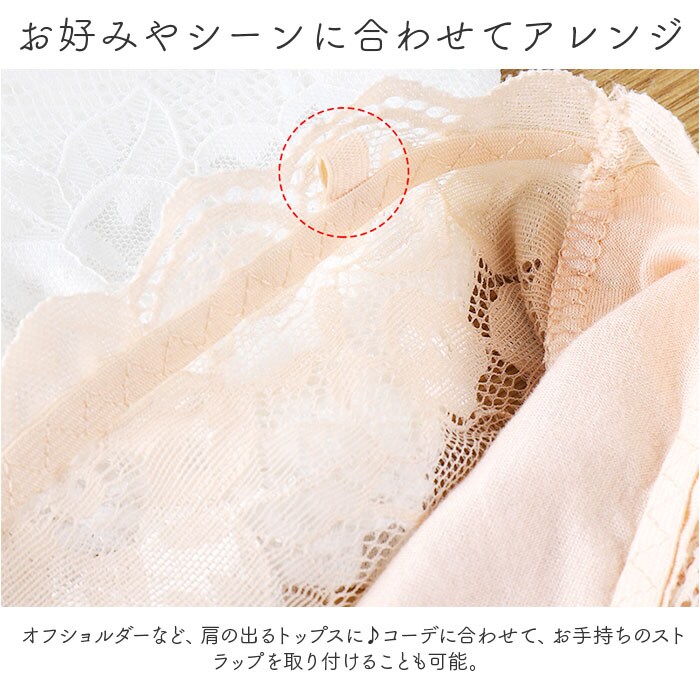 | 商品説明 | 動きやすく色んなシーンで活躍!レースデザインが可愛い「チューブトップブラ」が新登場。【ヘルシーな肌魅せが叶う♪】バストまわりを包むチューブトップブラ。シャツや透け感のあるトップスに忍ばせるだけで、おしゃれにキマる☆【締めつけずにストレスフリー】ストレッチ性のあるノンワイヤータイプ。締め付けることなく、心地よい着用感。【バストを優しくカバー】バスト部分(前方)は2重構造。お手持ちのシリコンブラなどと合わせると、程よくシルエットをキープ。【頭からすっぽり被るだけ】ホックなどがなく、着脱がとっても簡単。着替えもスマートに。【お好みやシーンに合わせてアレンジ】オフショルダーなど、肩の出るトップスに♪コーデに合わせて、お手持ちのストラップを取り付けることも可能。【ダンス衣装などにもおすすめ】動きを妨げず、通気性の良い薄手のレースデザイン。ダンスなどの衣装インナーにも♪ |