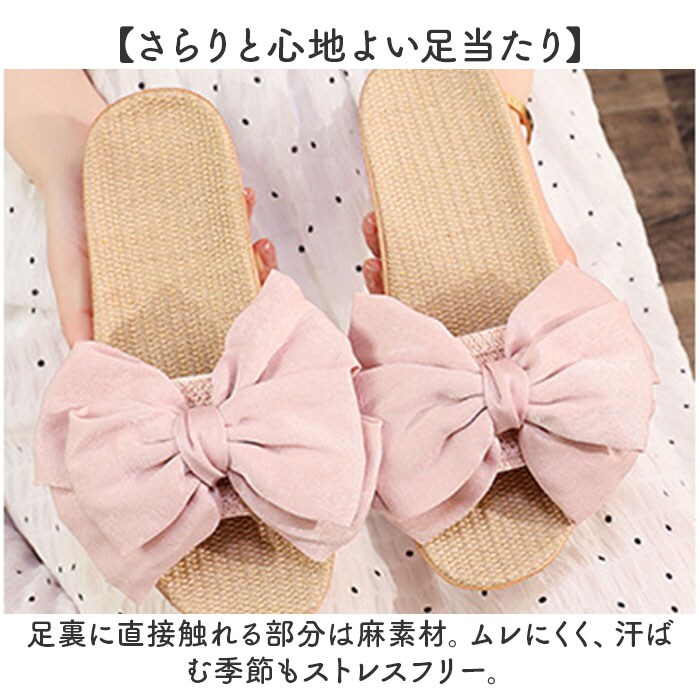 | 商品説明 | 【足元をおしゃれに彩り気分もアップ】大きなリボンがポイント♪パッと華やいで、快適に過ごせる「ルームシューズ」が新登場。【大人女子にぴったりな可愛らしさ】涼しげな風合いに、立体的なリボンが印象的☆お家時間が楽しくなるアイテム。【スタンダードなオープントゥタイプ】つま先があいたオープントゥデザイン。歩行時の圧迫感を感じにくく、足入れもスムーズ。【さらりと心地よい足当たり】足裏に直接触れる部分は麻素材。ムレにくく、汗ばむ季節もストレスフリー。【床材を傷つけにくいフラットソール】高さのないソールで安定感をプラス。程よい弾力があり、フローリングへの傷つきもガード。【お気に入りを選べるカラー】ベーシックや爽やかなカラーをラインナップ!来客用に色違い揃えもおすすめ。 |