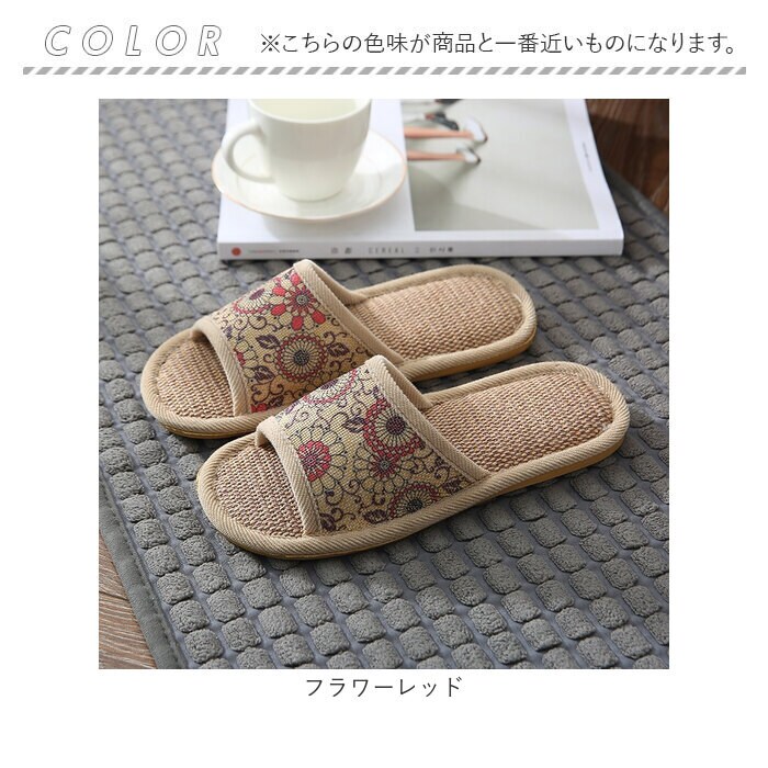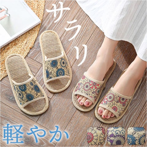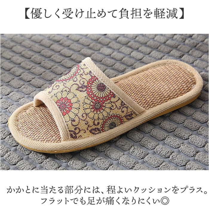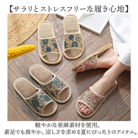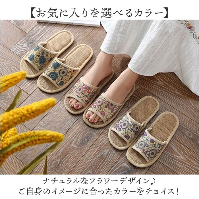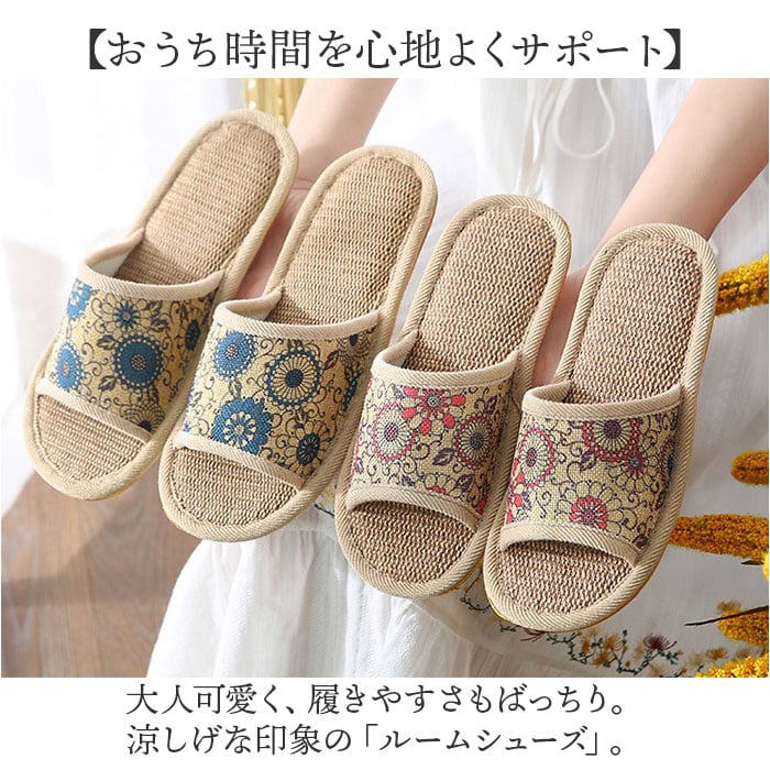 | 商品説明 | 【おうち時間を心地よくサポート】大人可愛く、履きやすさもばっちり。涼しげな印象の「ルームシューズ」。【サラリとストレスフリーな履き心地】軽やかな亜麻素材を使用。素足でも爽やか、涼しさを求める夏にぴったりのアイテム。【通気性抜群で嫌なムレを抑える】つま先のあいたオープントゥデザイン。熱がこもりにくく、汗ばむ季節も快適。【優しく受け止めて負担を軽減】かかとに当たる部分には、程よいクッションをプラス。フラットでも足が痛くなりにくい◎【歩きやすく滑りを防げて安心】屈曲性のある仕上がりに、溝の刻まれた底面。フローリングでも滑りにくく、安全面に配慮。【お気に入りを選べるカラー】ナチュラルなフラワーデザイン♪ご自身のイメージに合ったカラーをチョイス! |