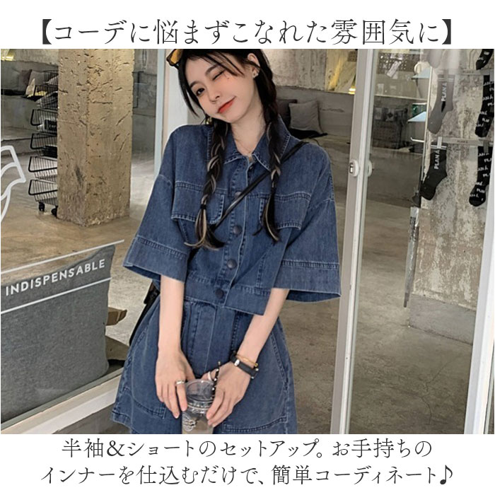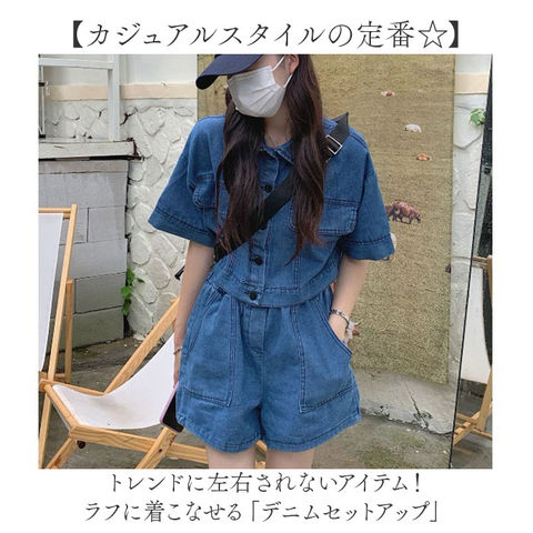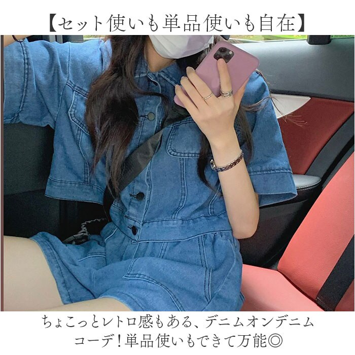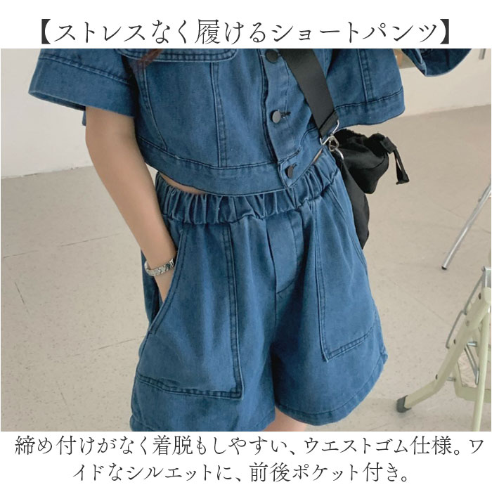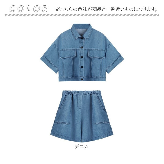 | 商品説明 | 【カジュアルスタイルの定番☆】トレンドに左右されないアイテム!ラフに着こなせる「デニムセットアップ」。【コーデに悩まずこなれた雰囲気に】半袖&ショートのセットアップ。お手持ちのインナーを仕込むだけで、簡単コーディネート♪【軽やかなジャケット風トップス】サッと羽織るように着られるトップス。ボタンを留めてトップスとして、お好みで開けてもOK。(※)胸元のポケットはフェイクです。【ストレスなく履けるショートパンツ】締め付けがなく着脱もしやすい、ウエストゴム仕様。ワイドなシルエットに、前後ポケット付き。【セット使いも単品使いも自在】ちょこっとレトロ感もある、デニムオンデニムコーデ!単品使いもできて万能◎ |